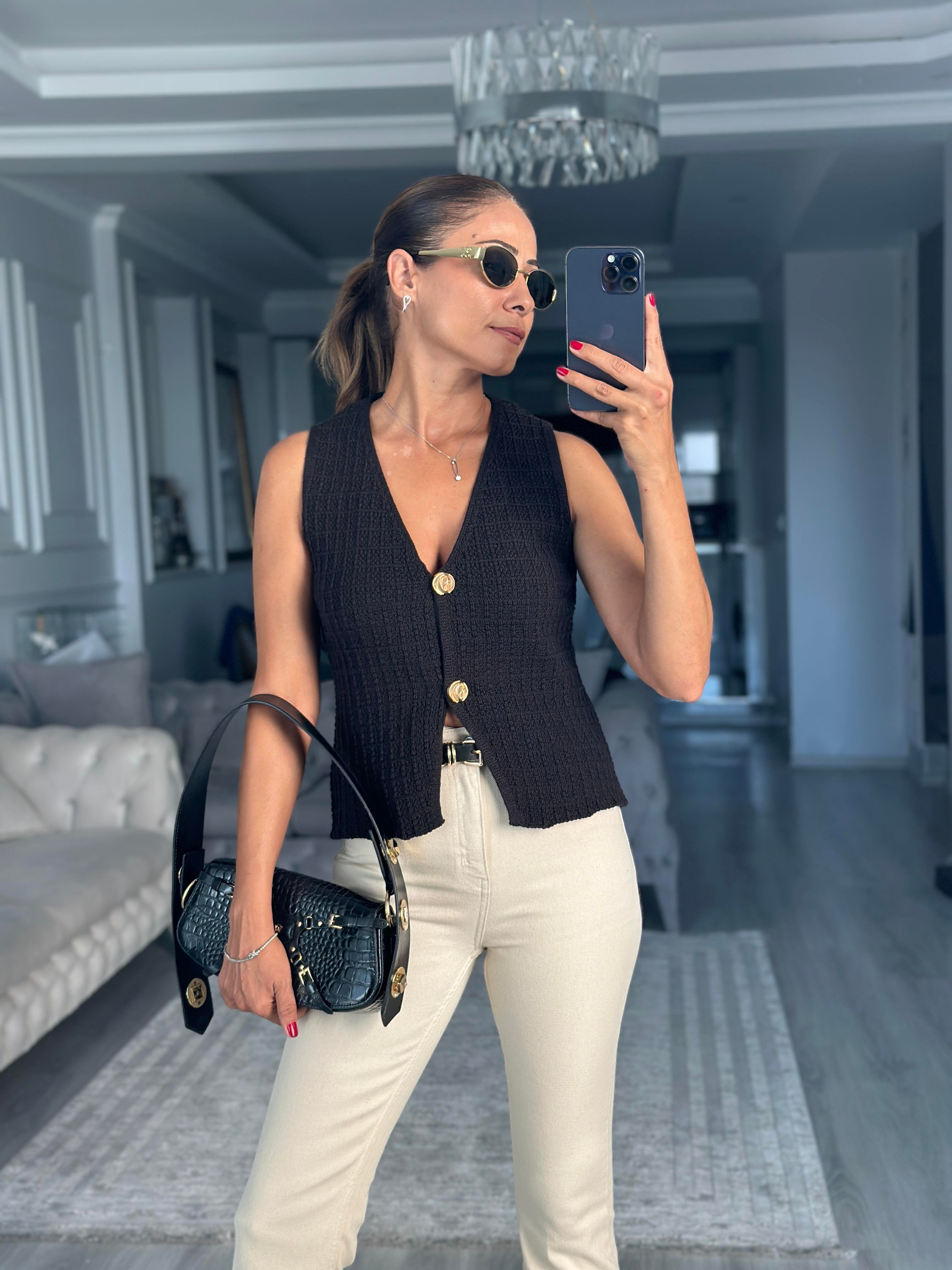 Siyah Sıfır Kol Gold Düğmeli Kadın Triko Yelek