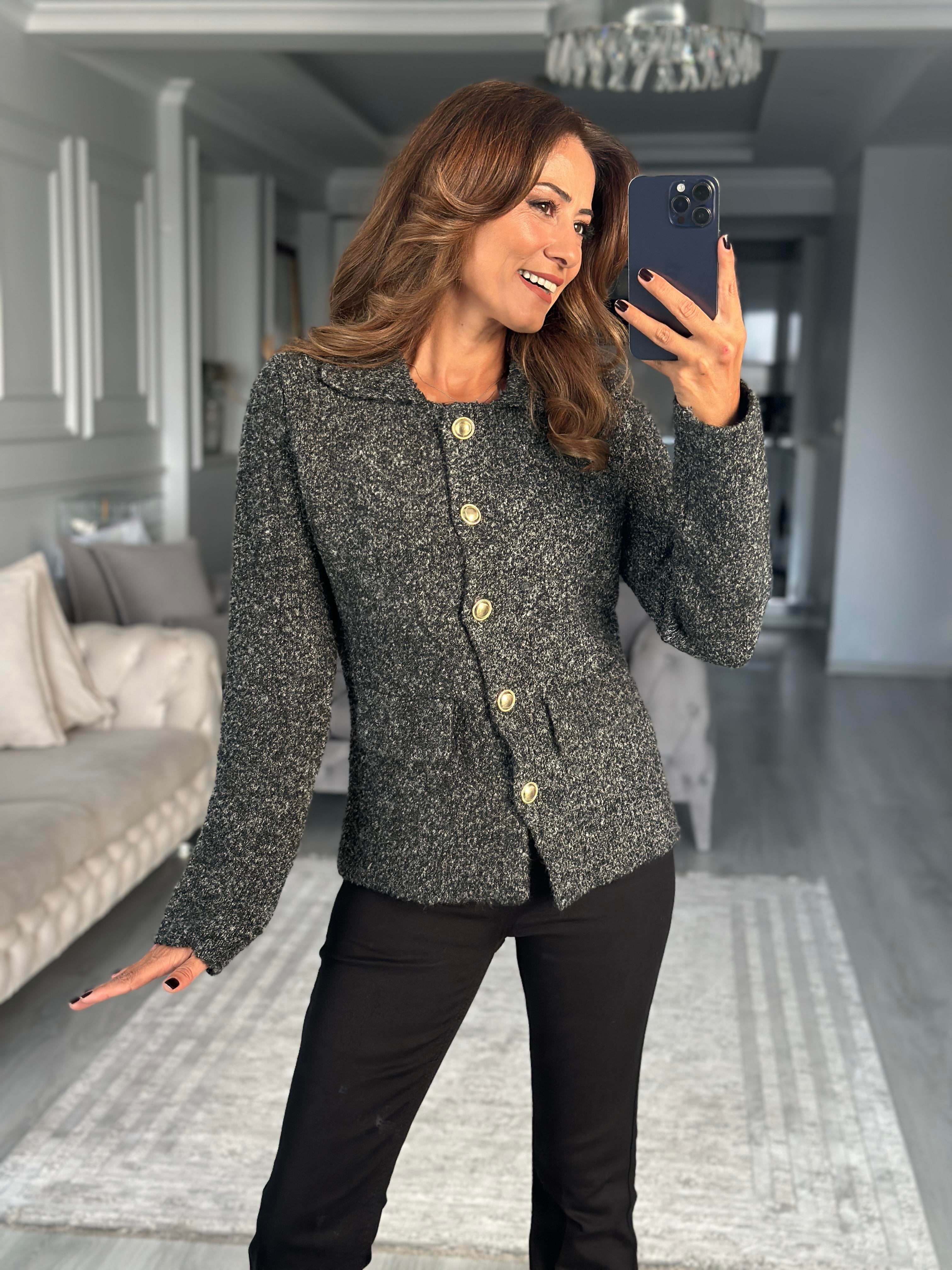 Antrasit Polo Yaka Düğmeli Cep Detaylı Triko Hırka