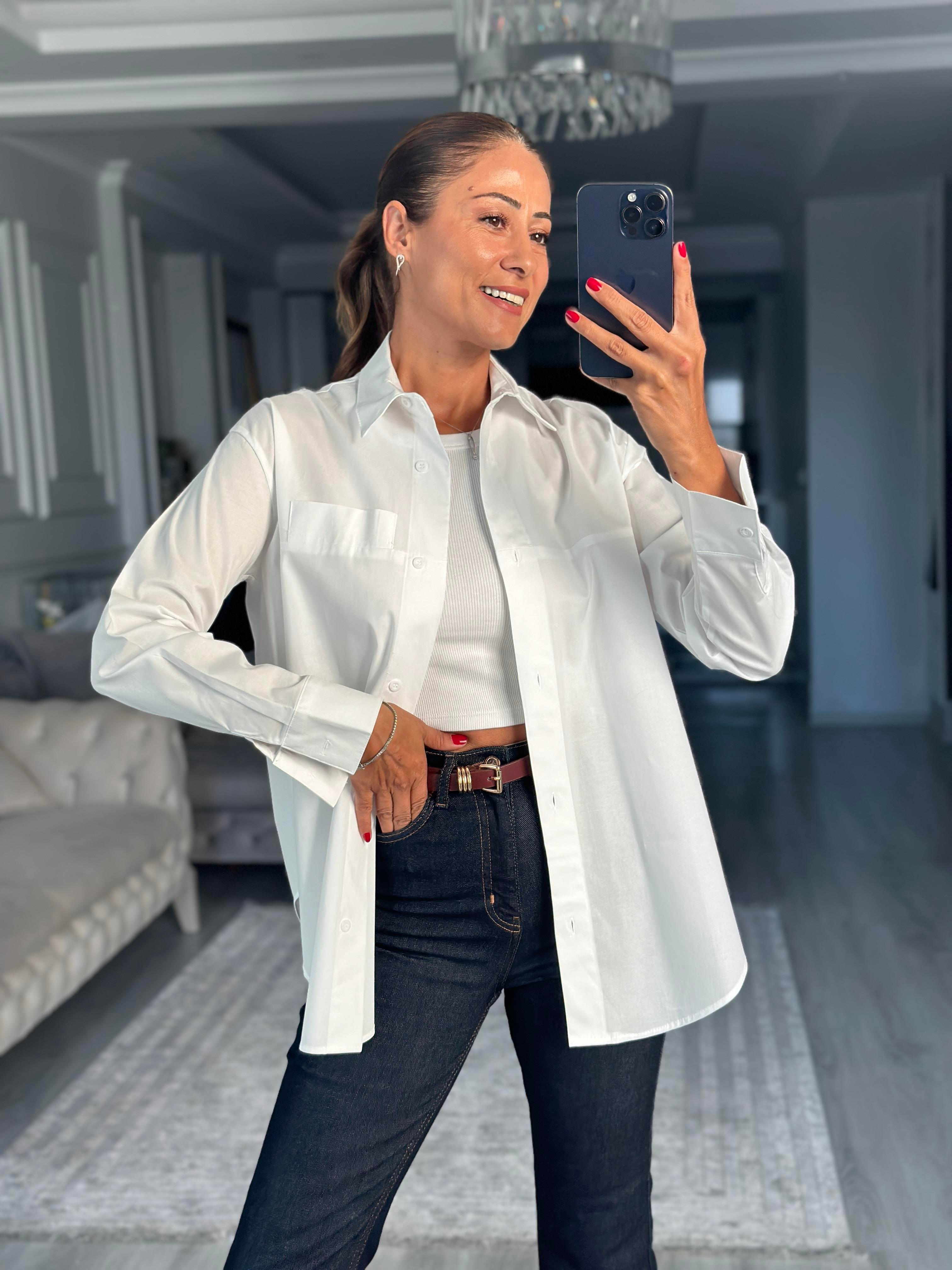 Beyaz Arkası Yırtmaçlı Dikiş Detay Poplin Kadın Gömlek