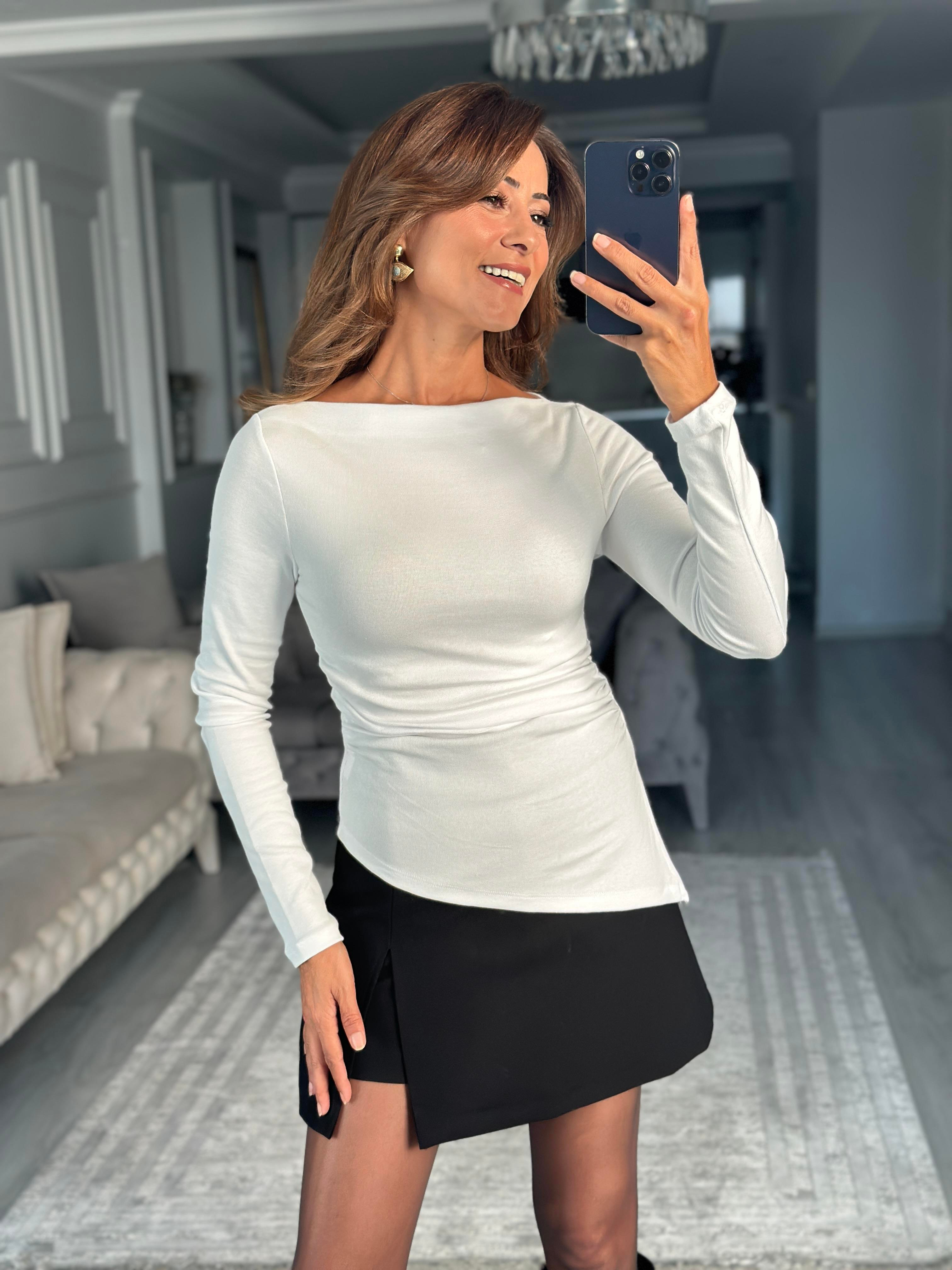 Beyaz Eteği Asimetrik Yırtmaçlı Kayık Yaka Uzun Kollu Kadın Bluz