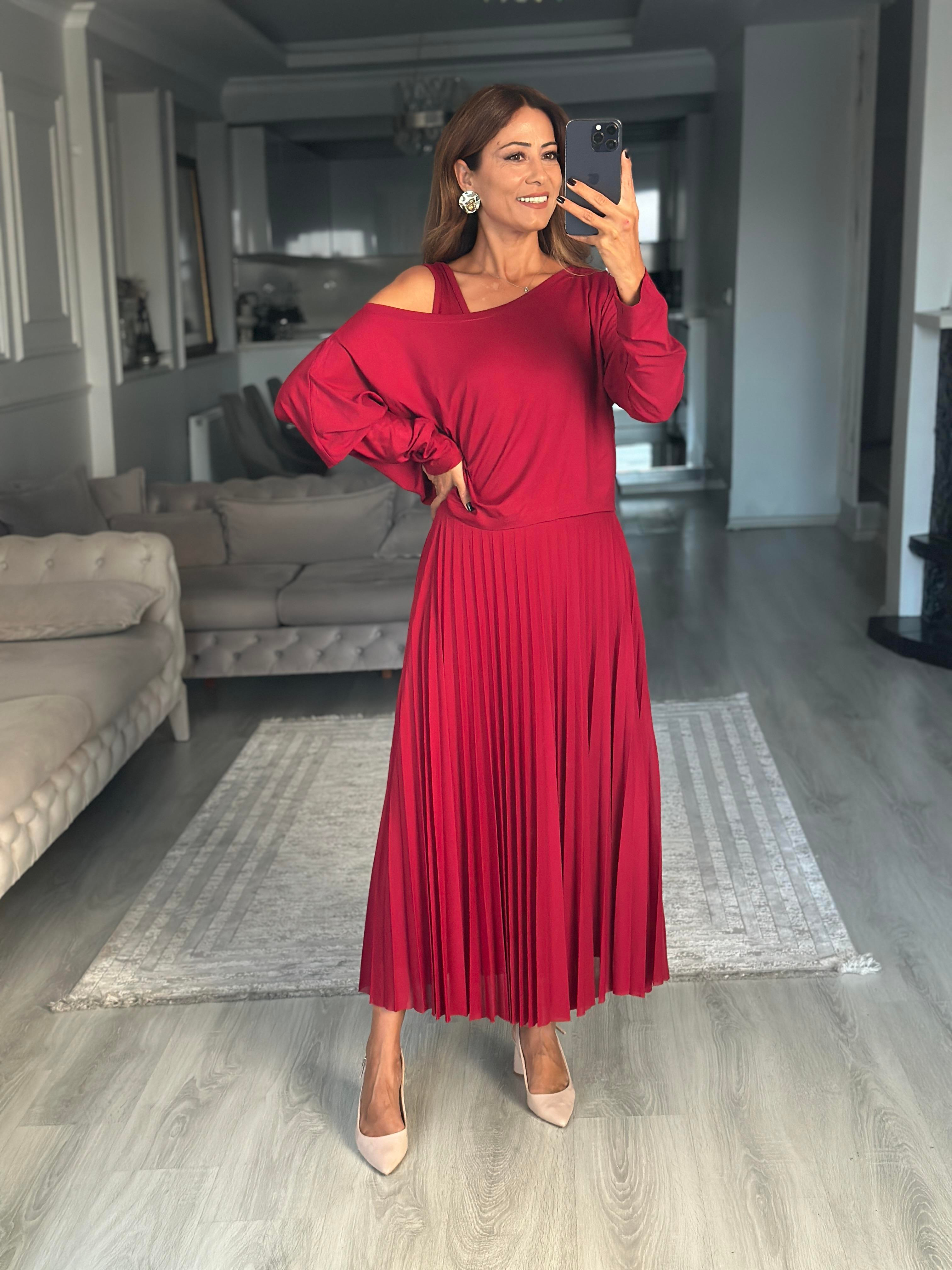Bordo Bluzlu Pliseli Midi Boy Kadın İkili Elbise