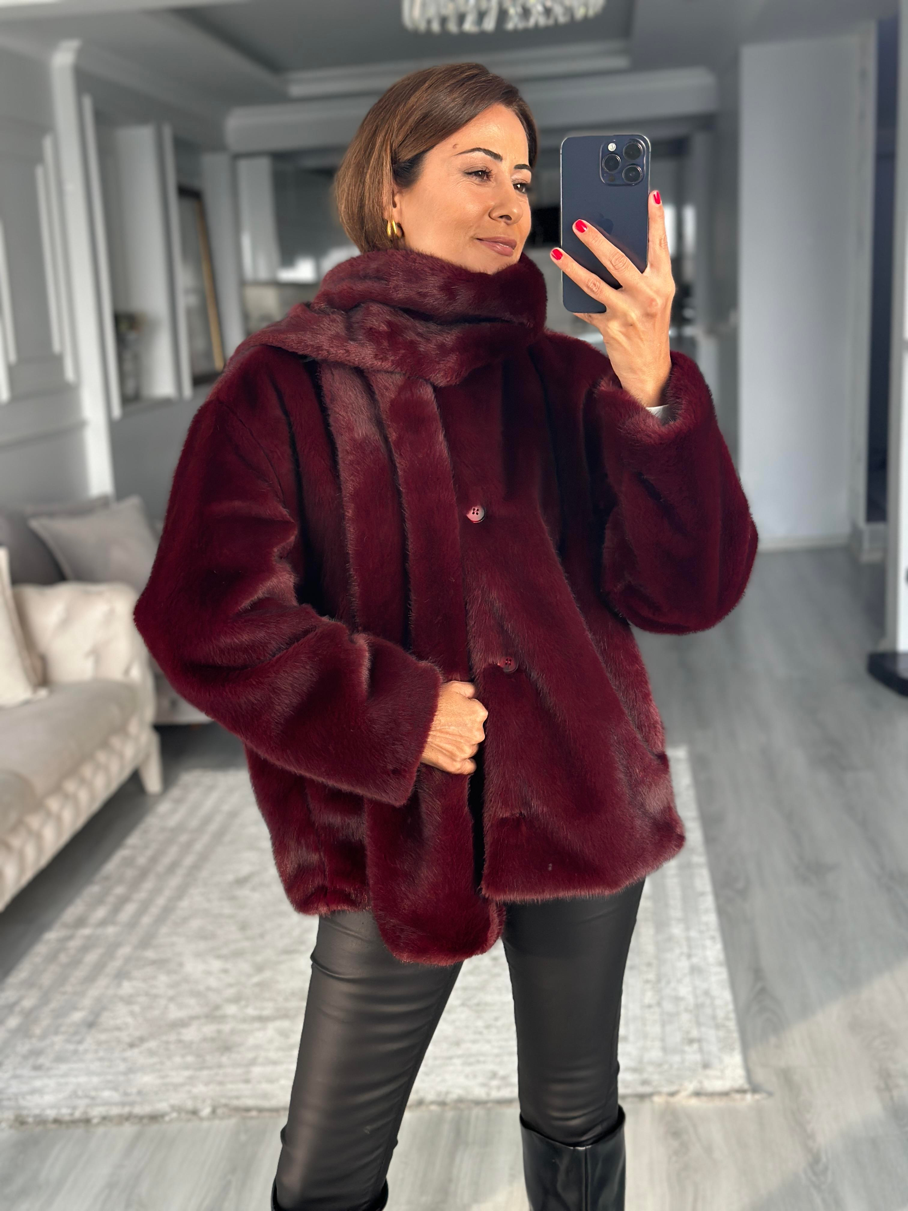 Bordo Önü Düğmeli Atkılı Kadın Kürk Mont