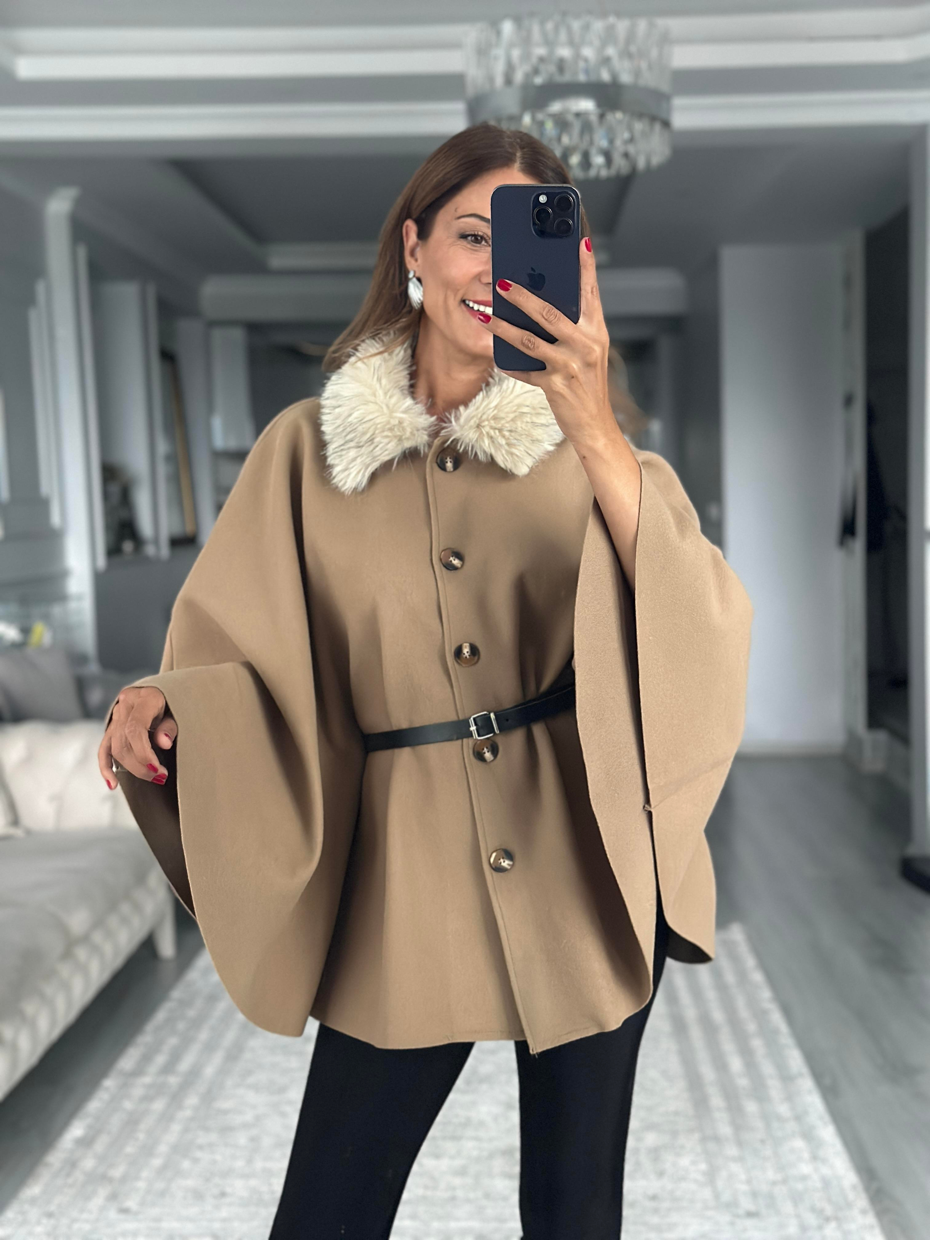 Camel Yakası Kürklü Kemerli Kadın Kaşe Panço