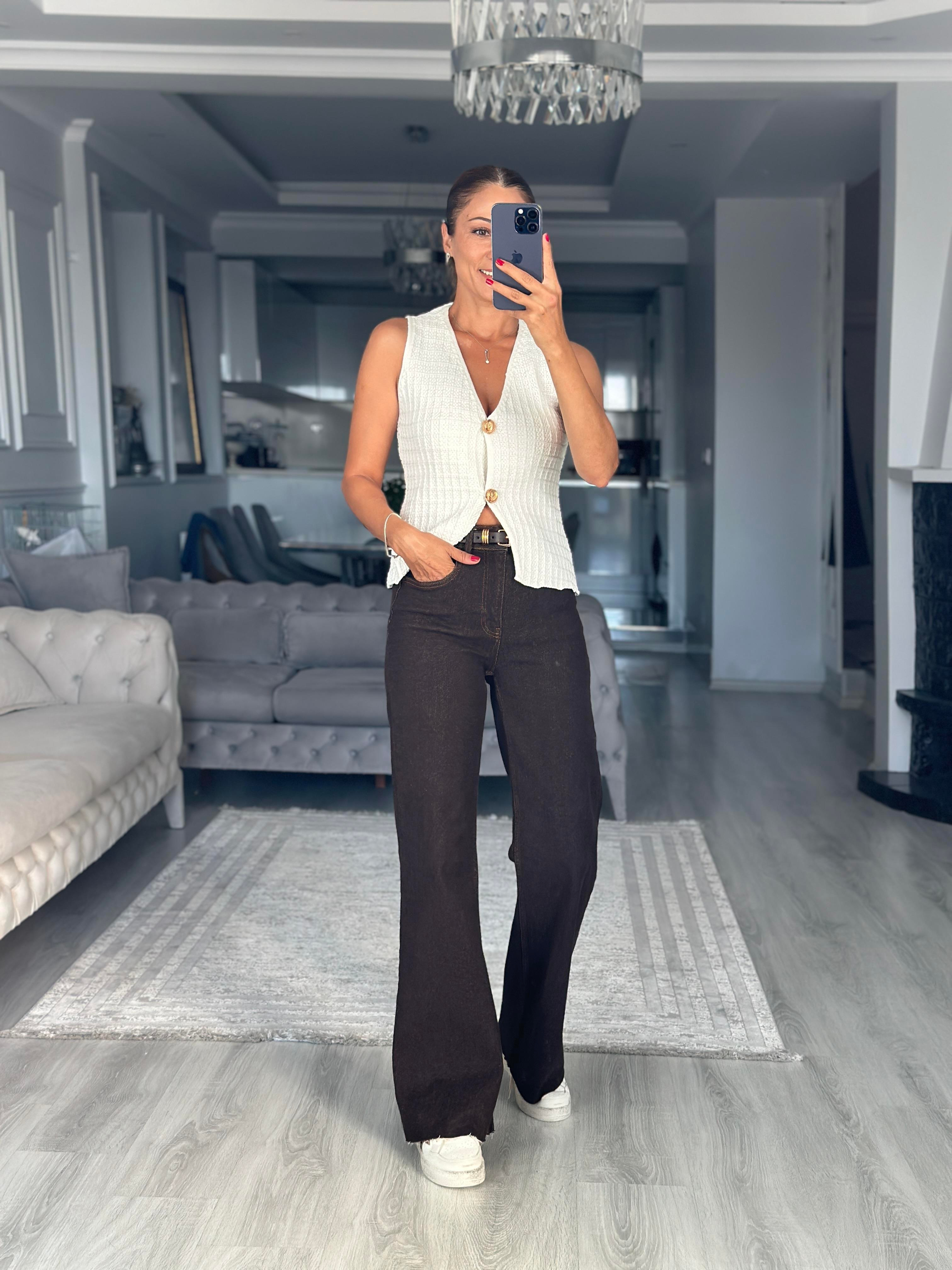 Antrasit Karol Yarım İspanyol Paça Push Up Kadın Jean Pantolon Ekru Sıfır Kol Gold Düğmeli Kadın Triko Yelek Kahverengi Sıfır Kol Gold Düğmeli Kadın Triko Yelek
