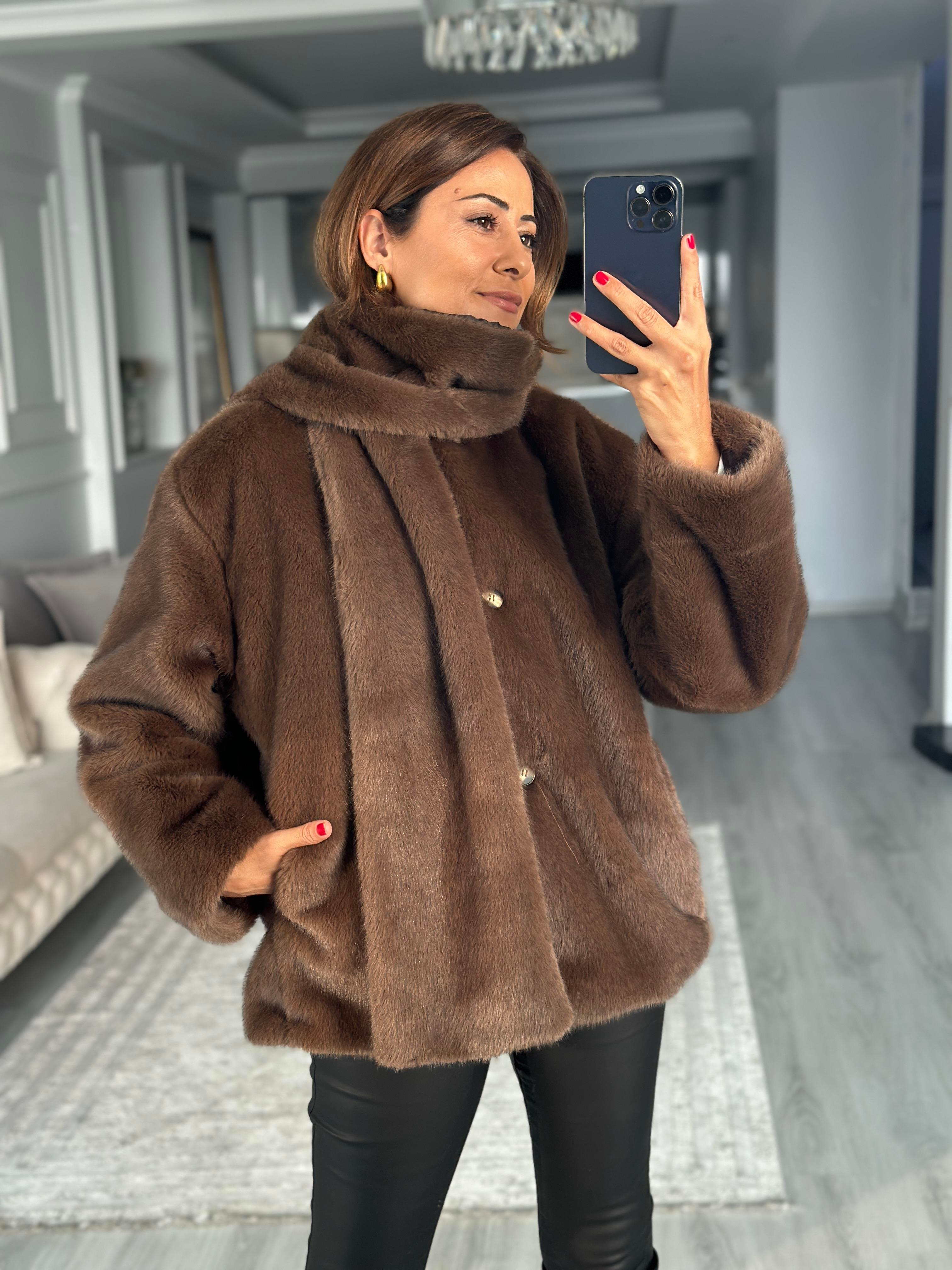 Kahverengi Önü Düğmeli Atkılı Kadın Kürk Mont (FOR5347)