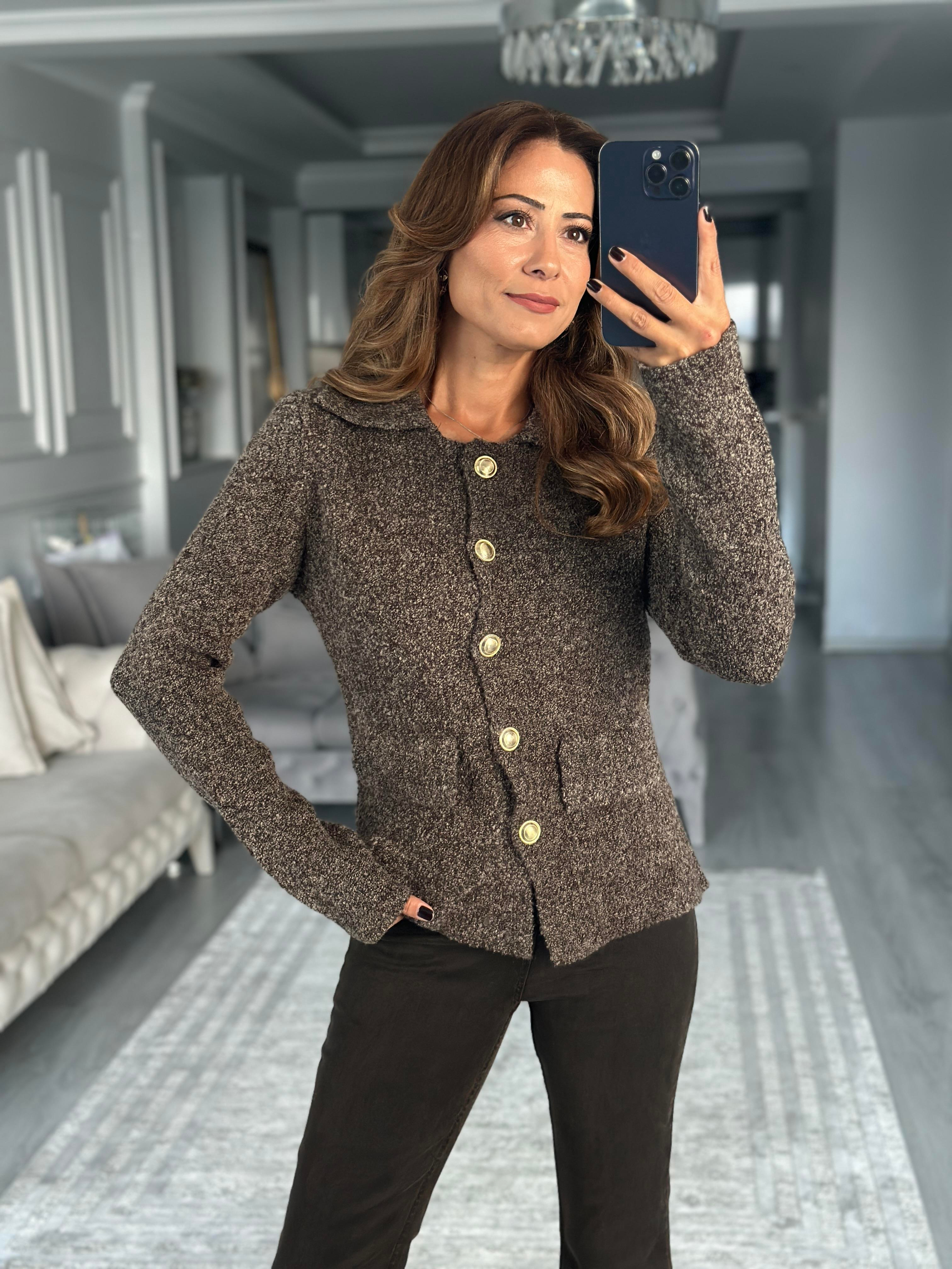 Kahverengi Polo Yaka Düğmeli Cep Detaylı Triko Hırka