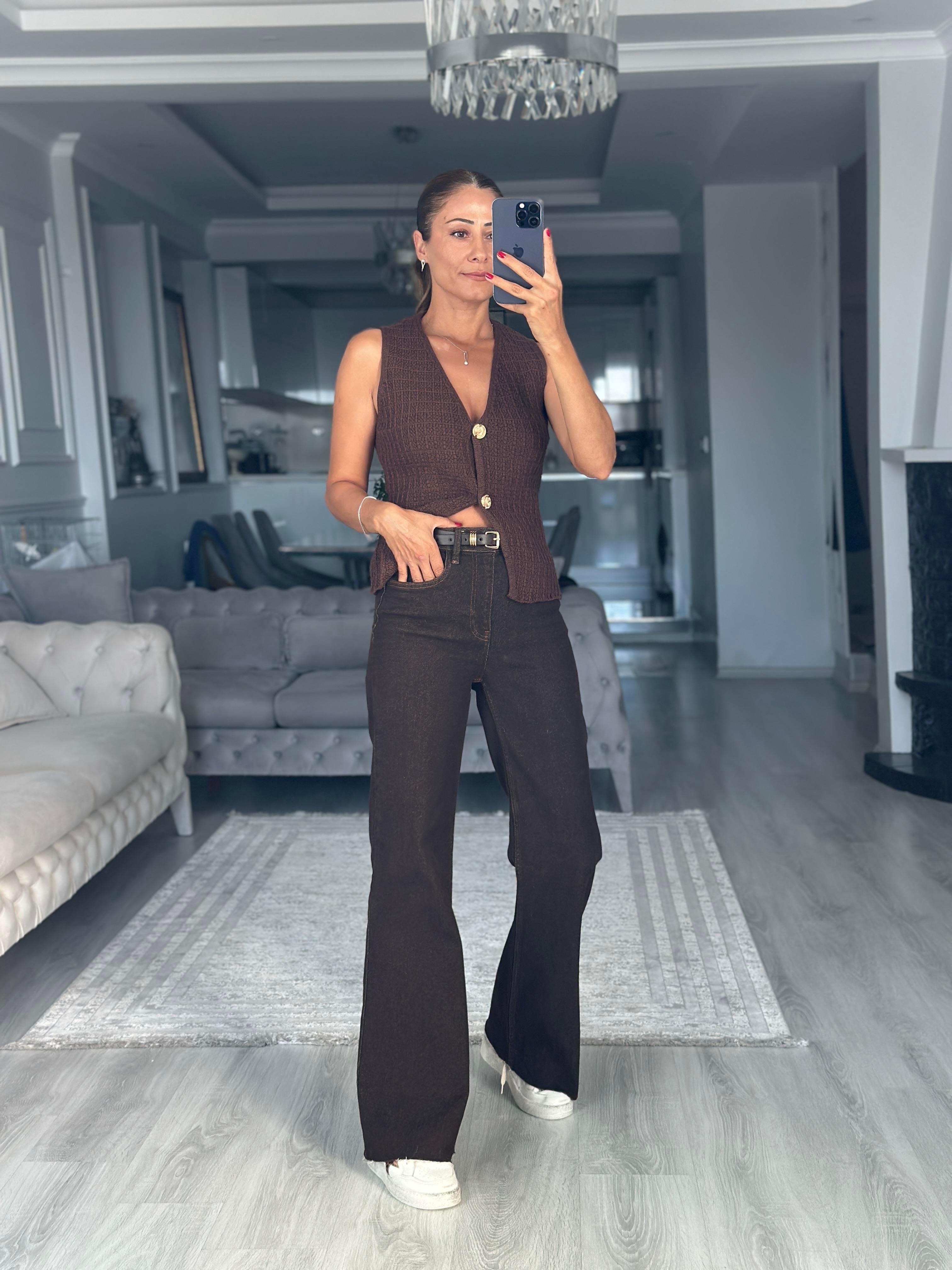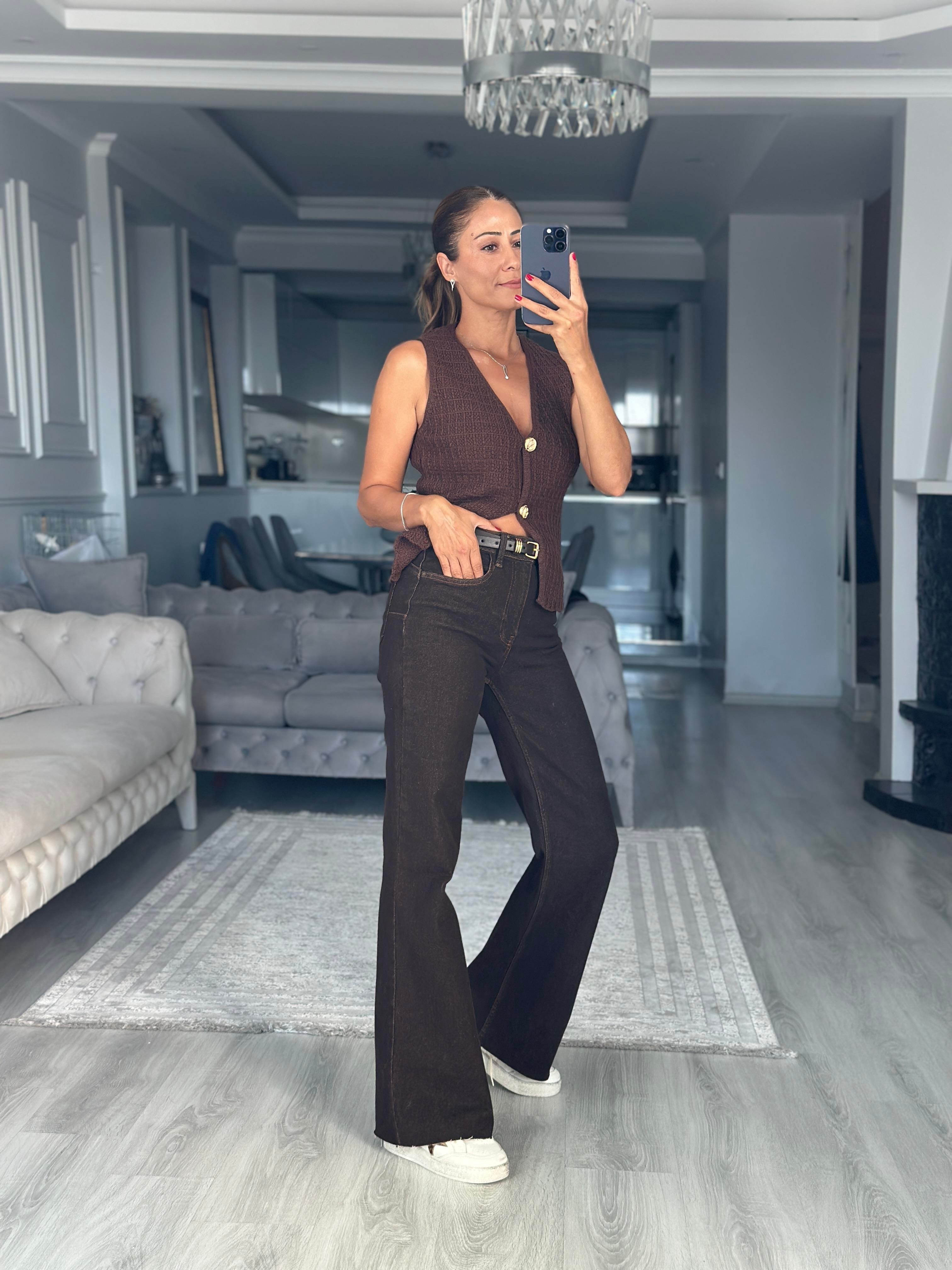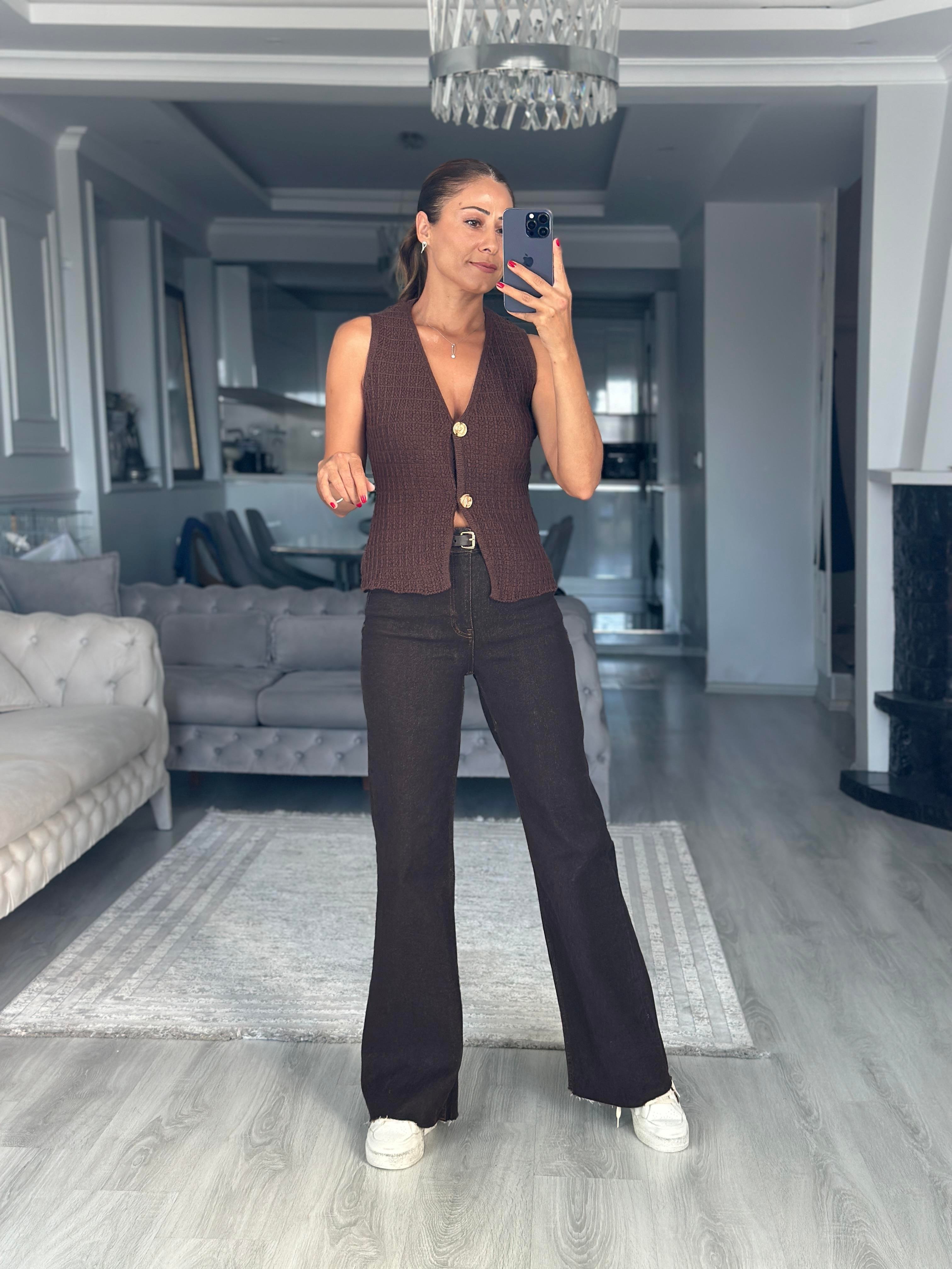 Kahverengi Karol Yarım İspanyol Paça Push Up Kadın Jean Pantolon Acı Kahverengi Sıfır Kol Gold Düğmeli Kadın Triko Yelek Ekru Sıfır Kol Gold Düğmeli Kadın Triko Yelek