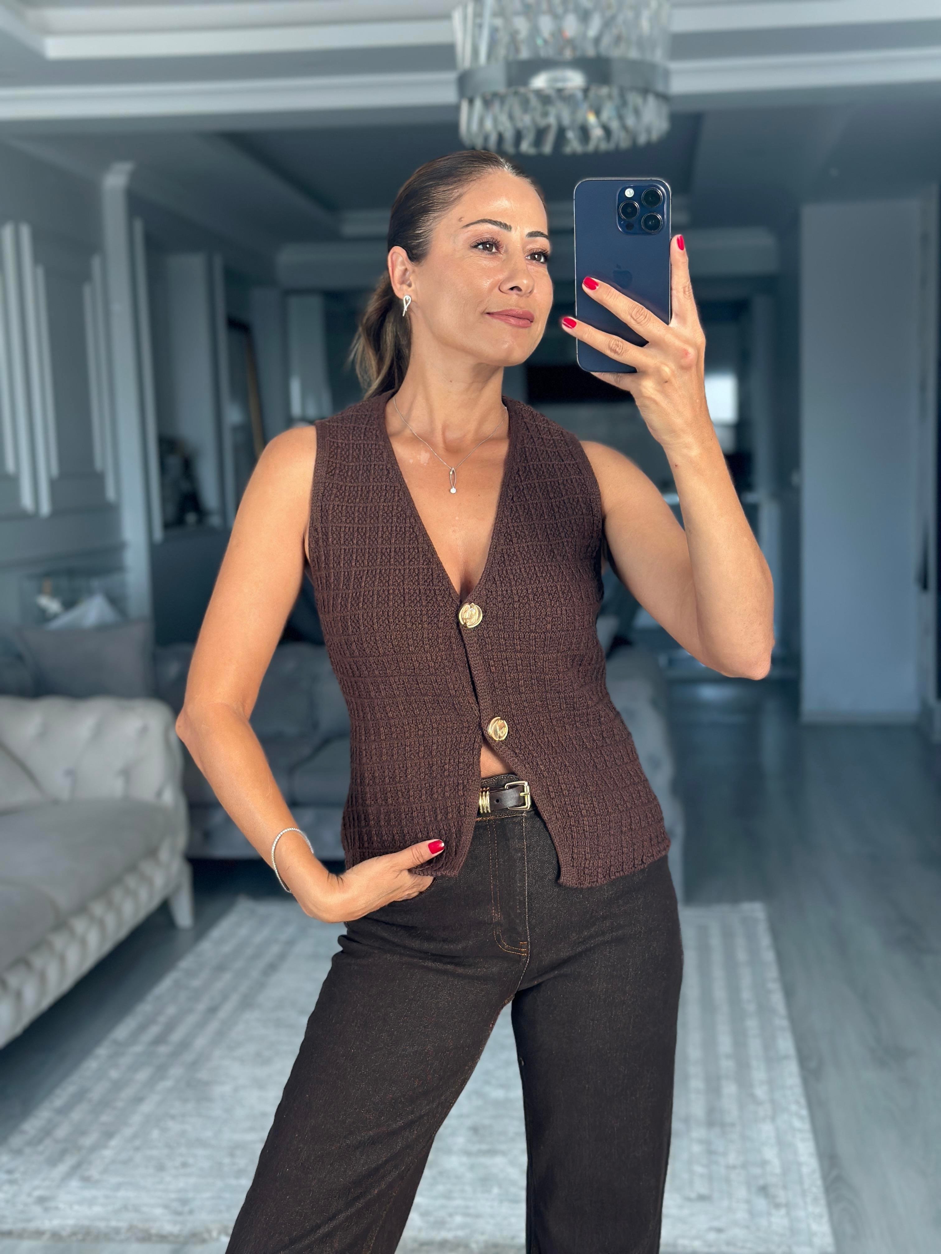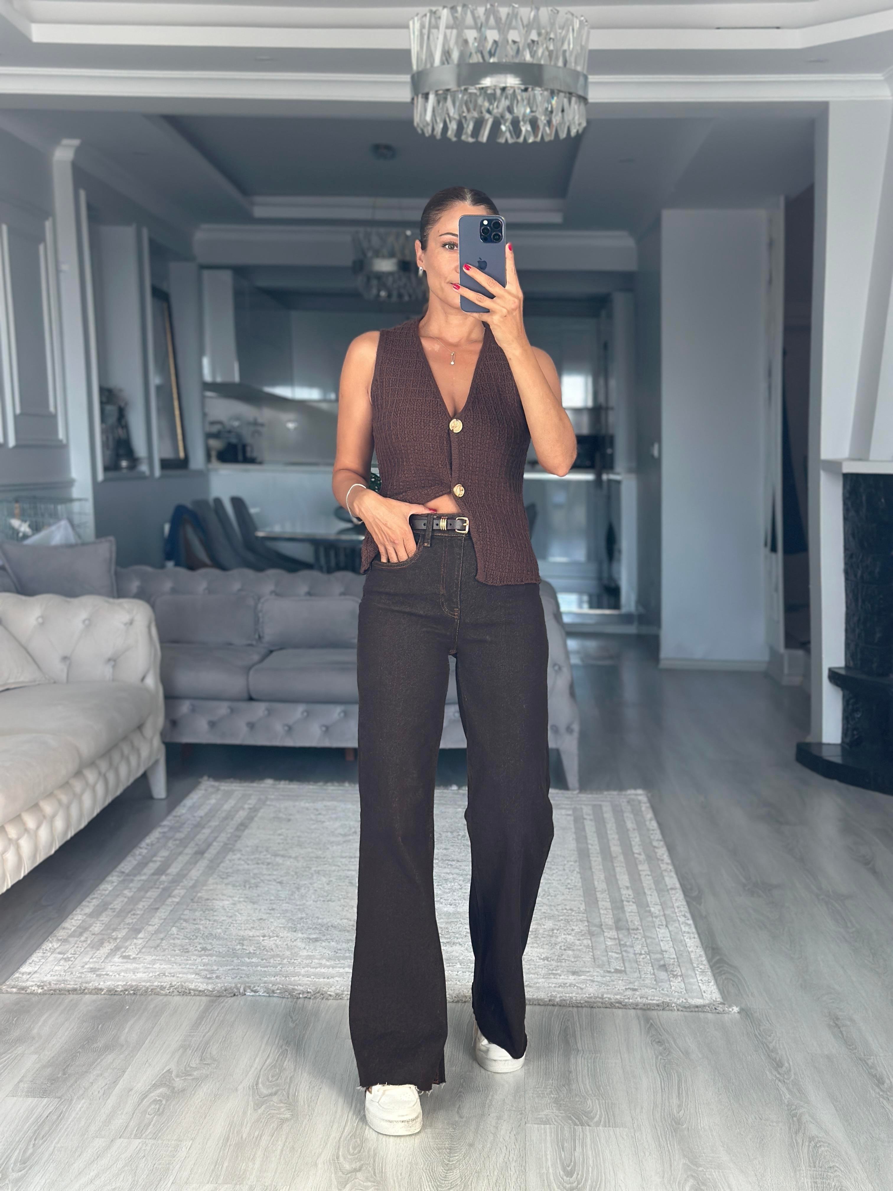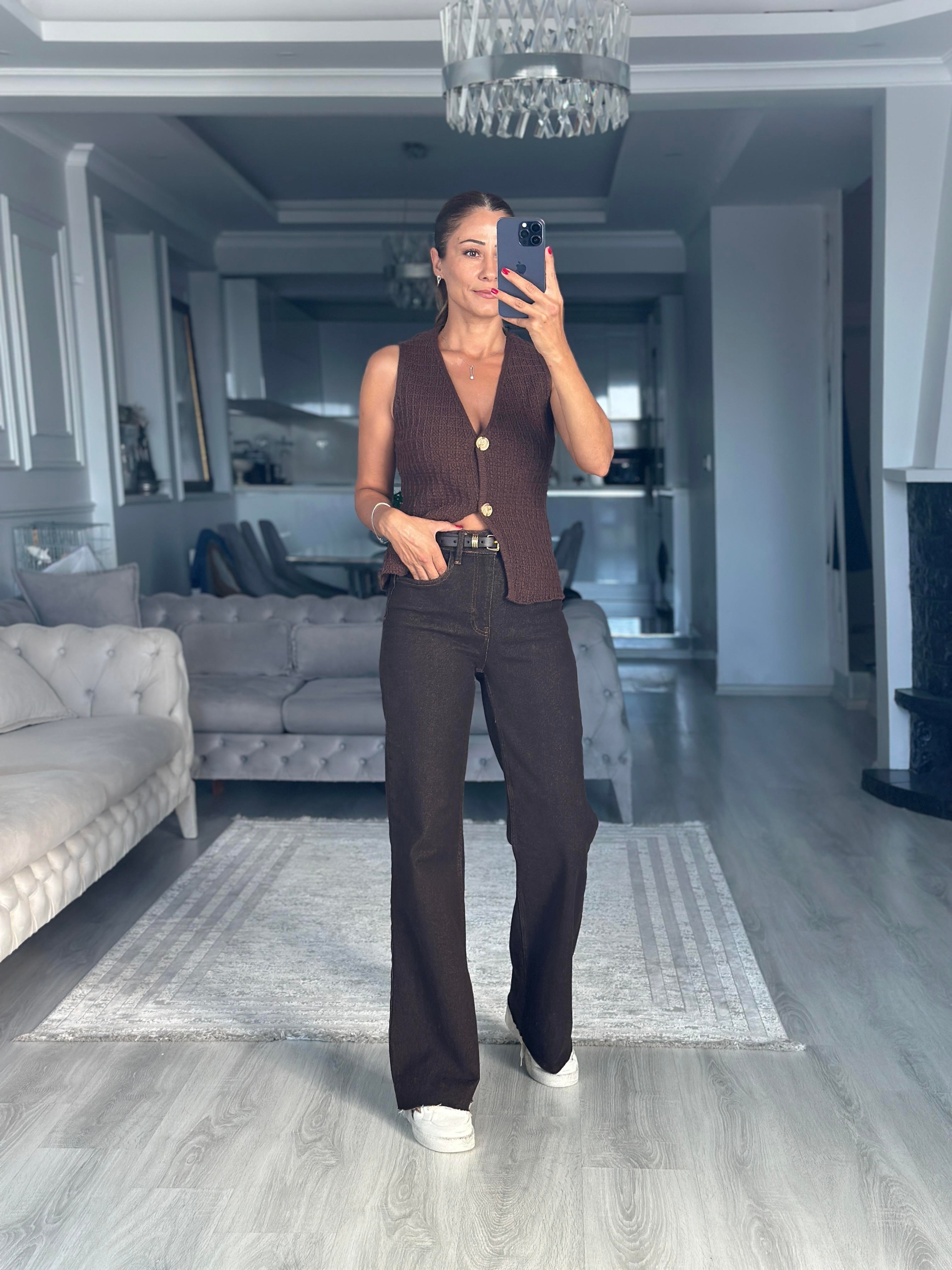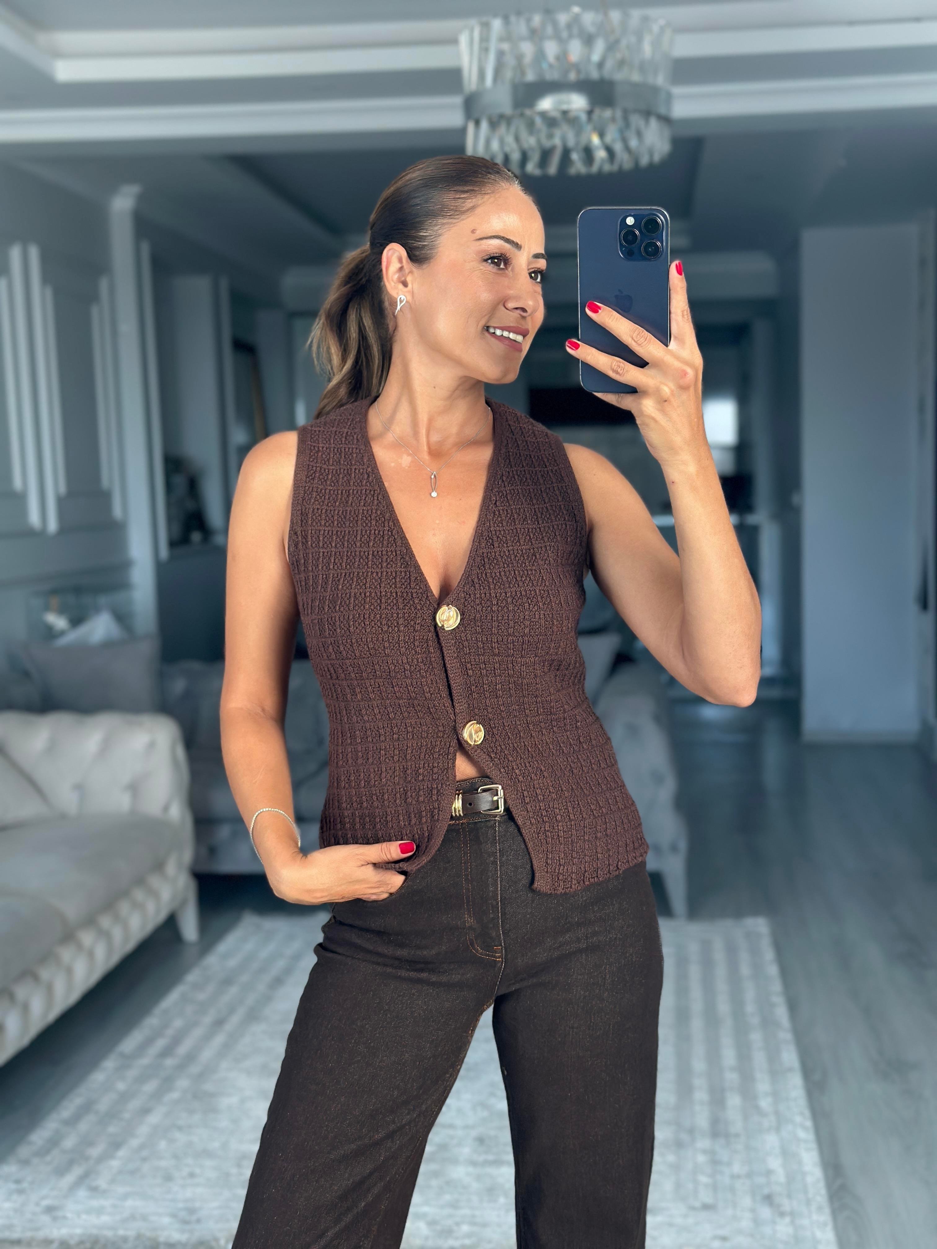 Kahverengi Karol Yarım İspanyol Paça Push Up Kadın Jean Pantolon Acı Kahverengi Sıfır Kol Gold Düğmeli Kadın Triko Yelek Ekru Sıfır Kol Gold Düğmeli Kadın Triko Yelek