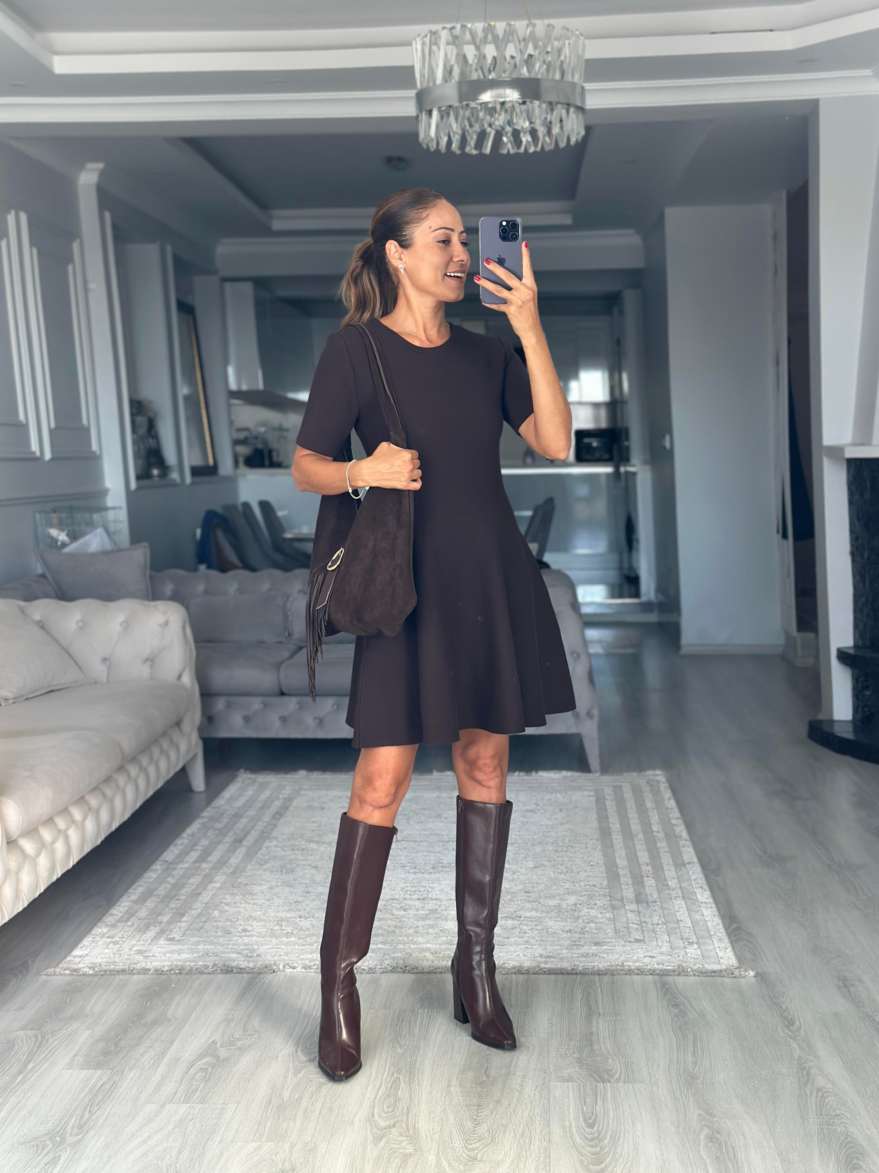 Koyu Kahverengi Bisiklet Yaka Volanlı Kadın Triko Elbise