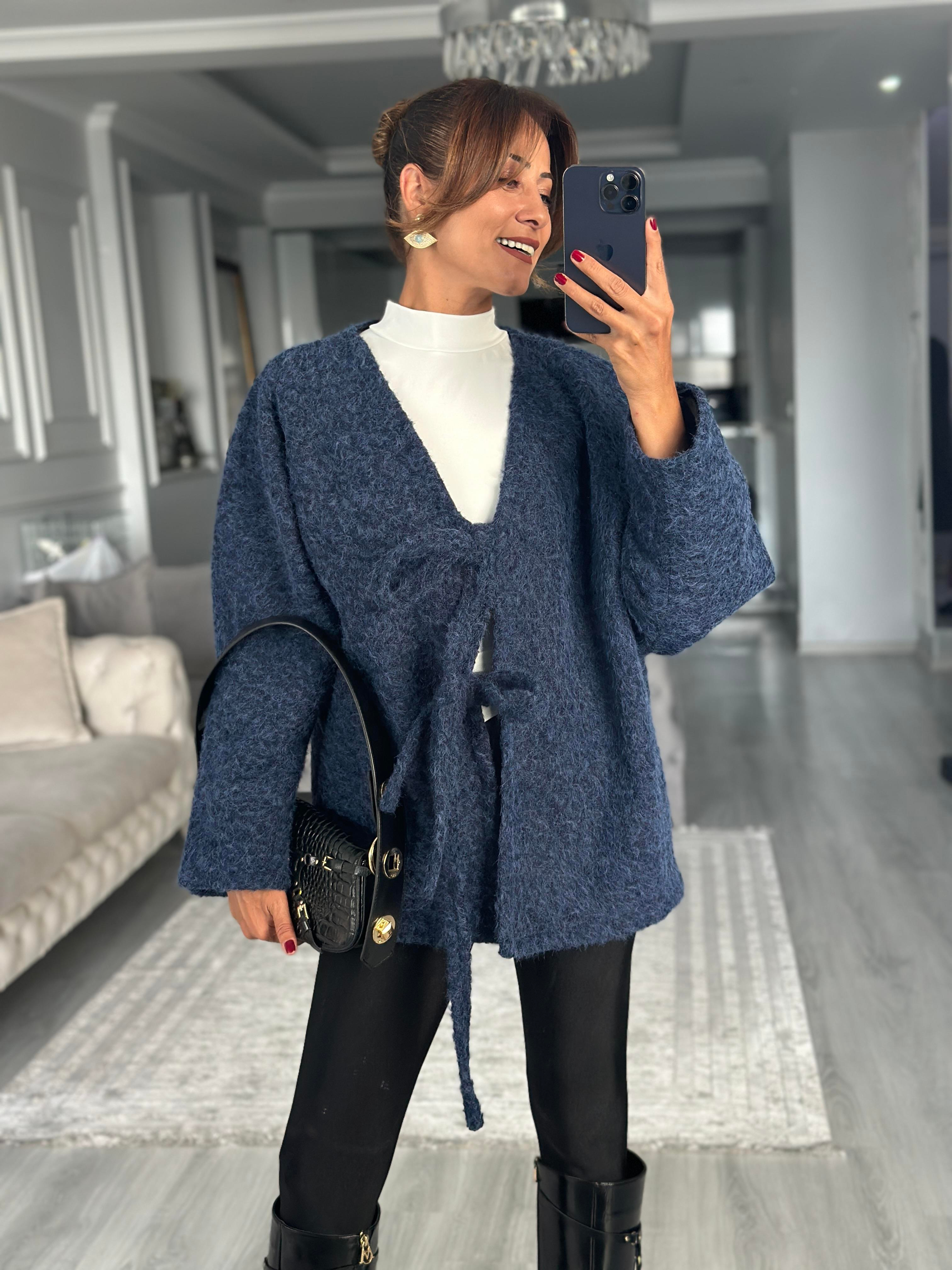 Lacivert Önü Bağlamalı Kırçıllı Kaşe Kadın Ceket