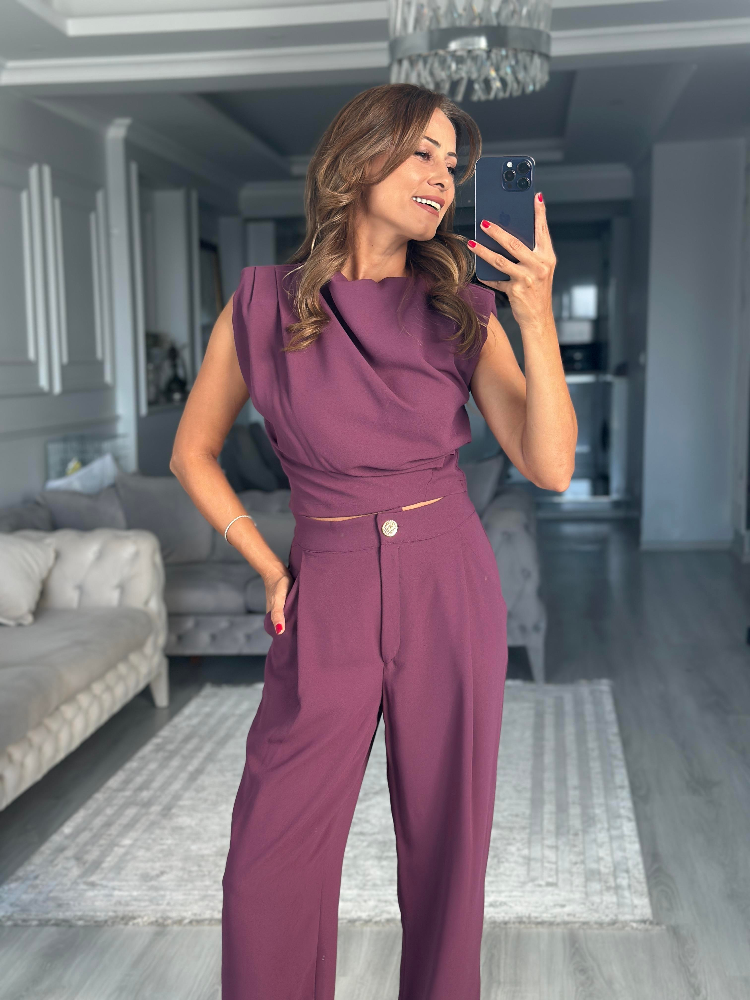 Mor Sıfır Kol Vatkalı Bluz Pantolon Kadın İkili Takım