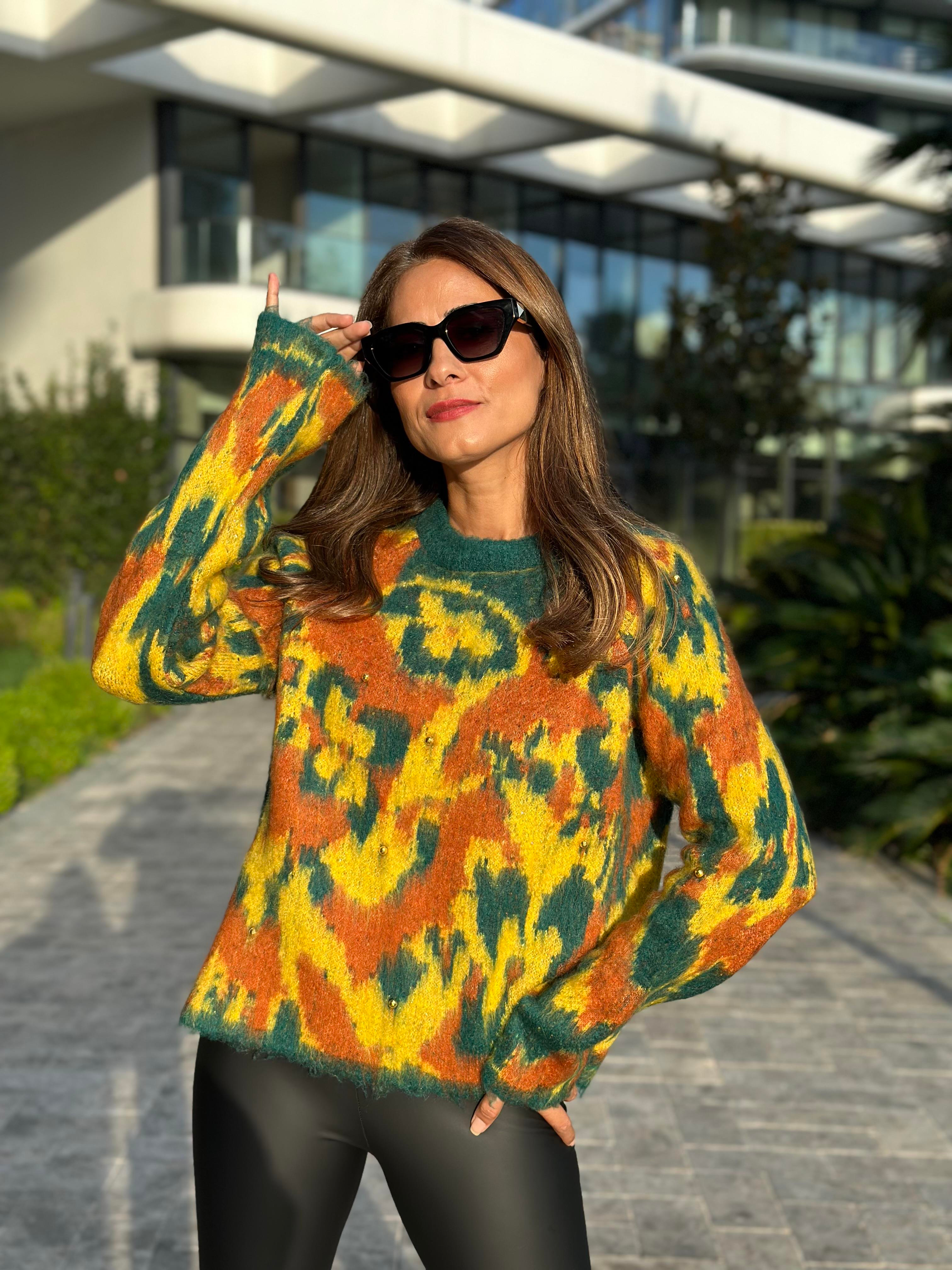 Sarı Yeşil Renkli Boncuk İşlemeli Şardonlu Kadın Kazak