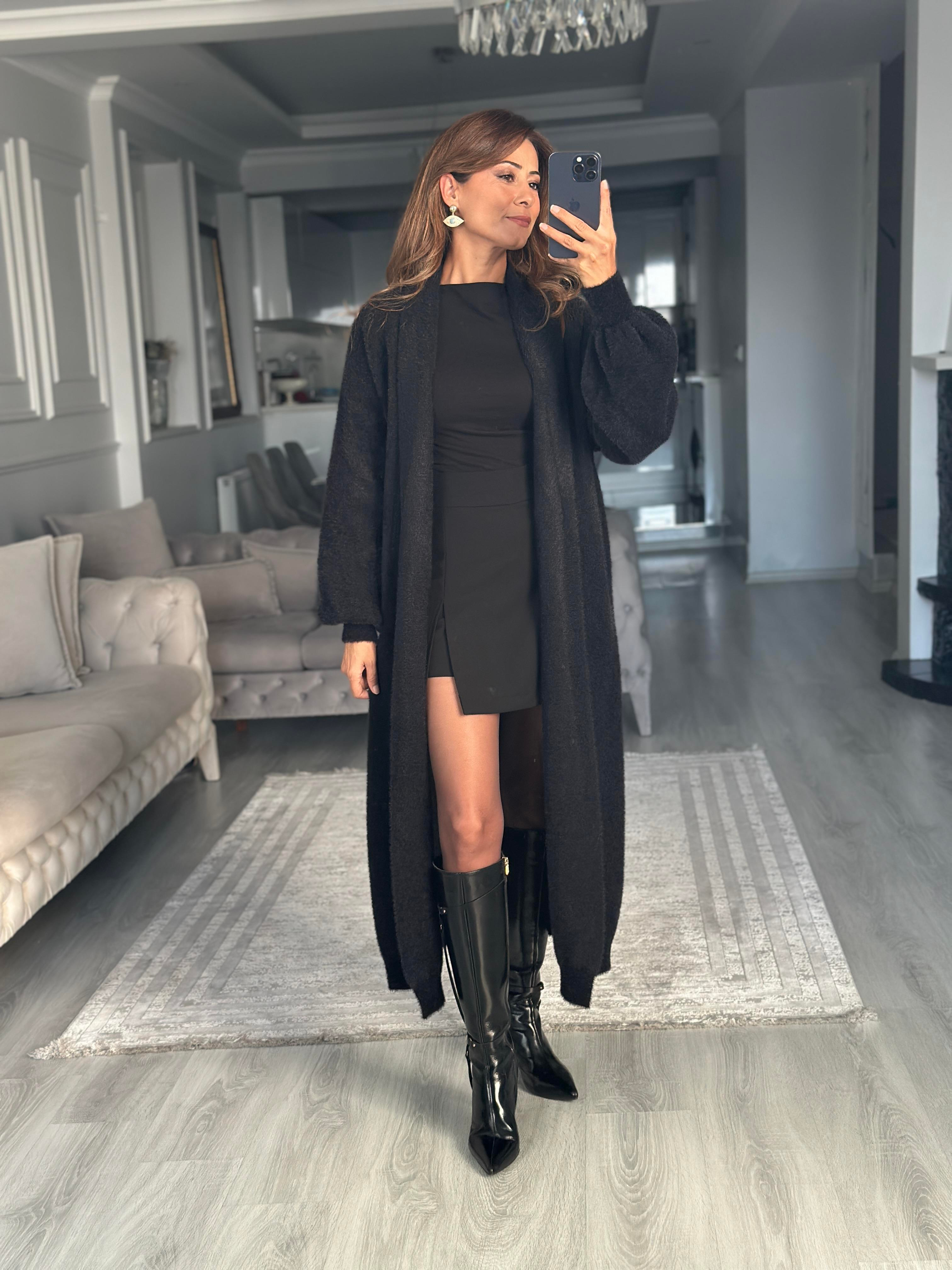 Siyah Balon Kol Sakallı Uzun Kadın Triko Hırka