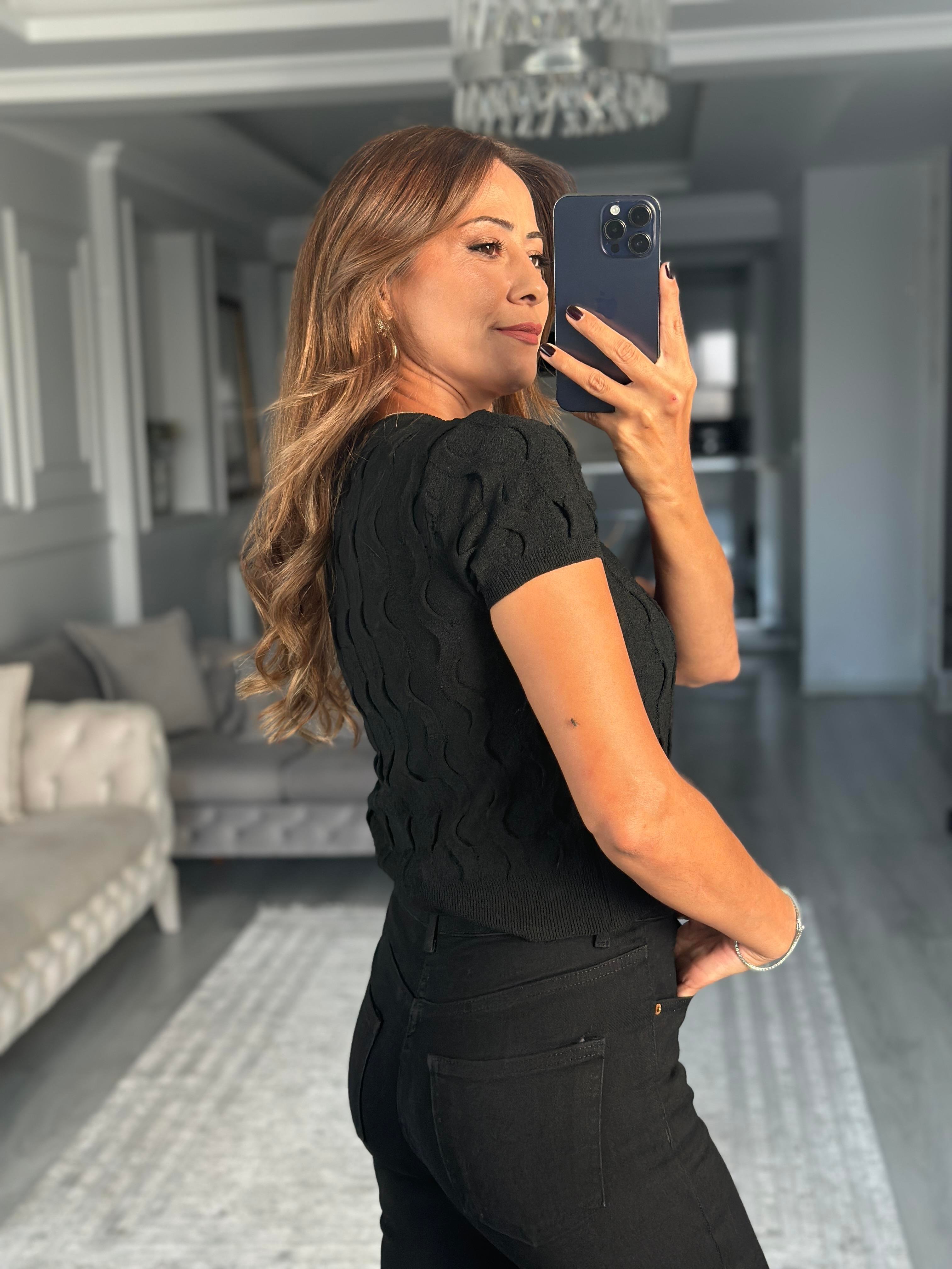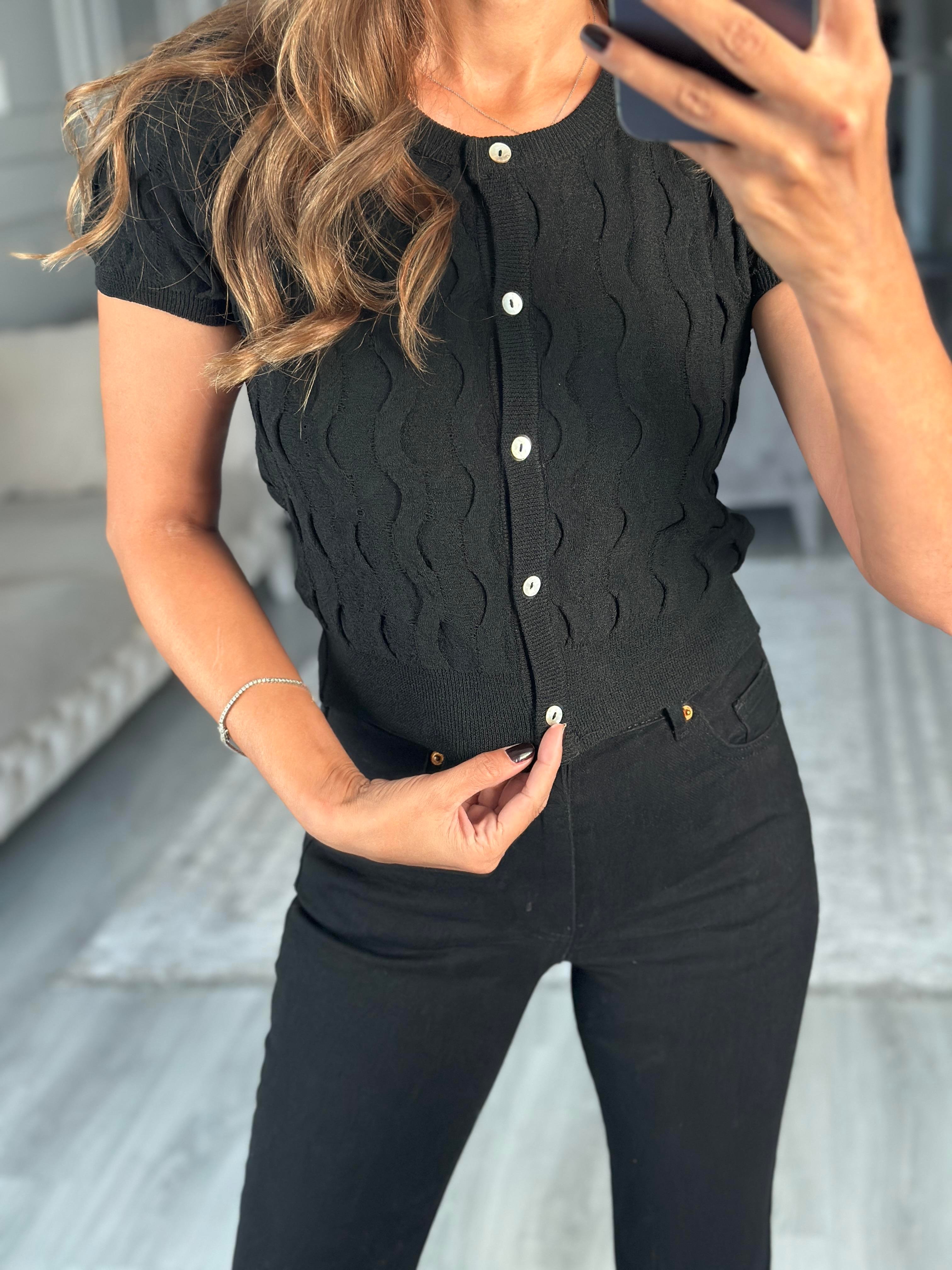 Siyah Bisiklet Yaka Dokulu Düğmeli Kadın Triko Hırka