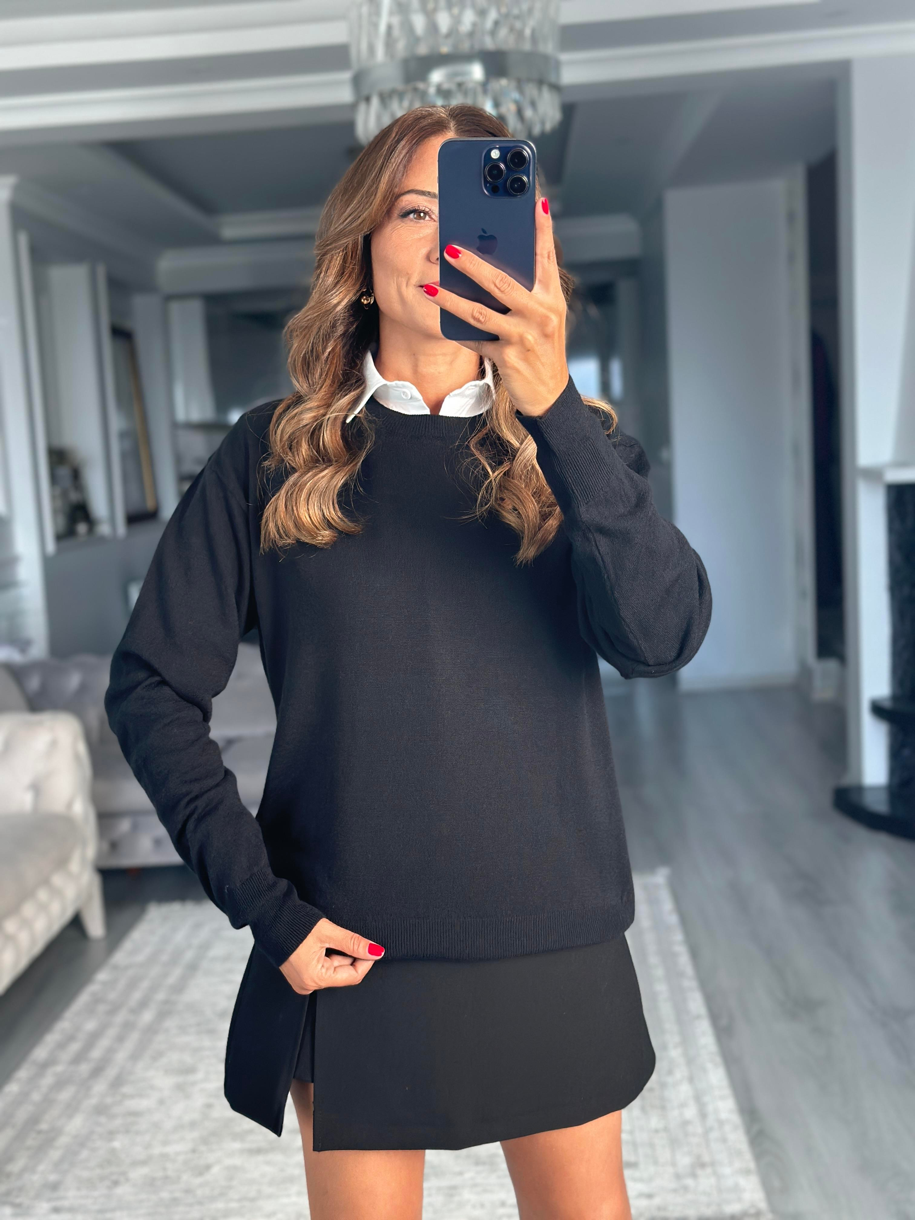 Siyah Bisiklet Yaka Yünlü Basic Kadın Triko Kazak (FOR5215)