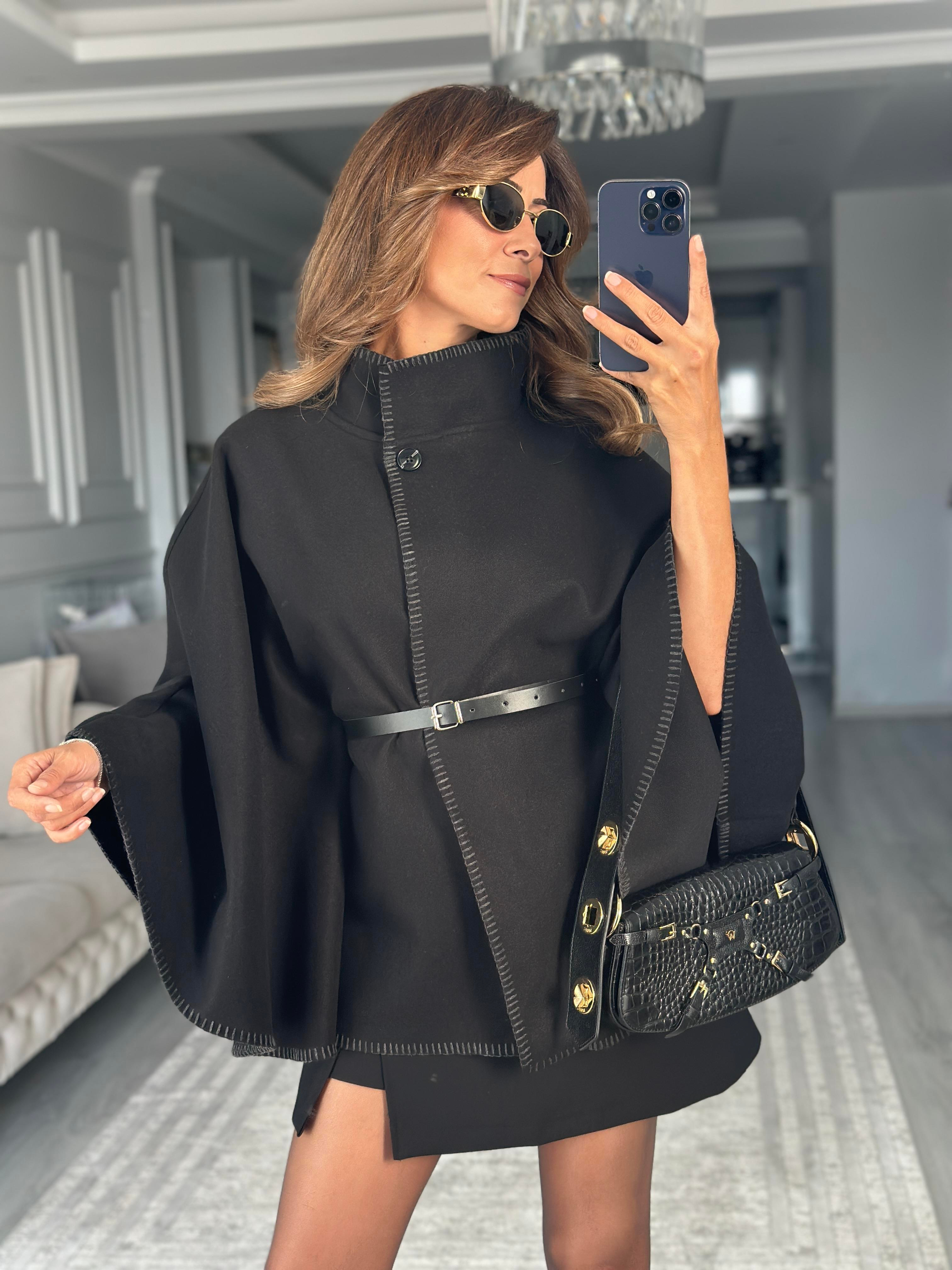 Siyah Çoban Dikişli Dik Yaka Kemerli Kadın Kaşe Panço (FOR5287)