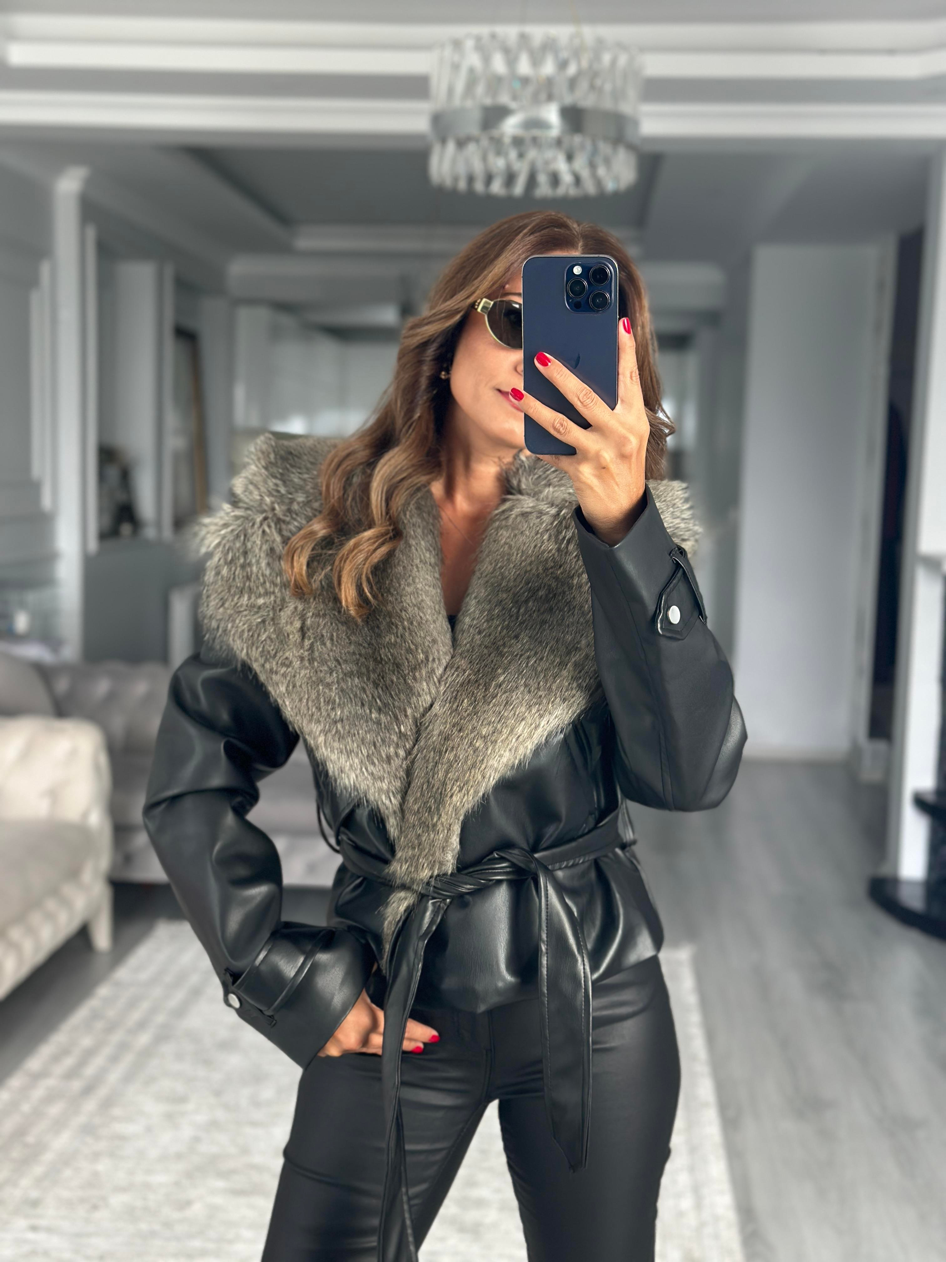 Siyah Kürk Detaylı Kuşaklı Kadın Deri Ceket