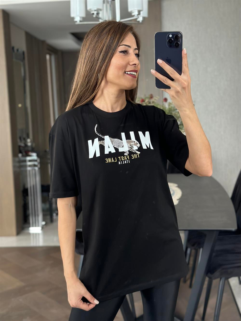 Siyah Mılan Yazı Baskılı Kadın T-Shirt