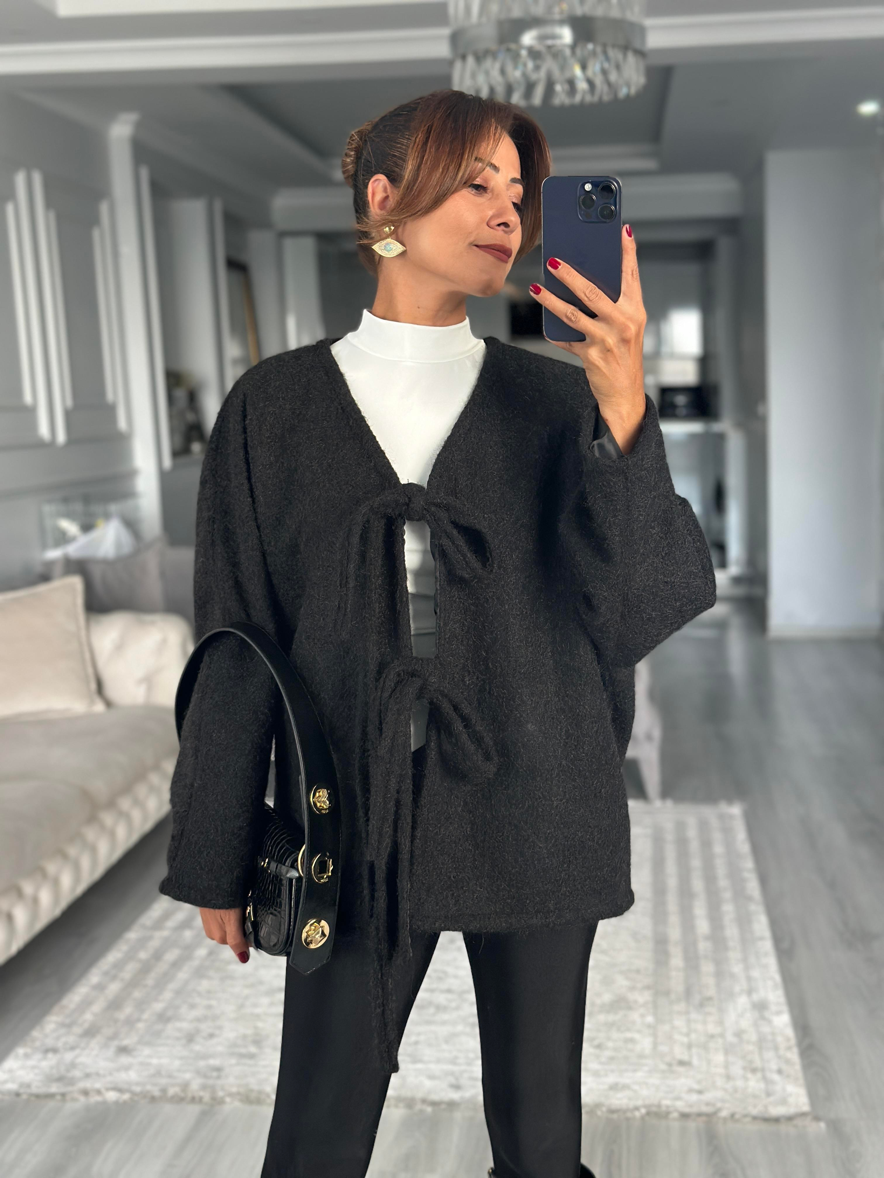 Siyah Önü Bağlamalı Kırçıllı Kaşe Kadın Ceket
