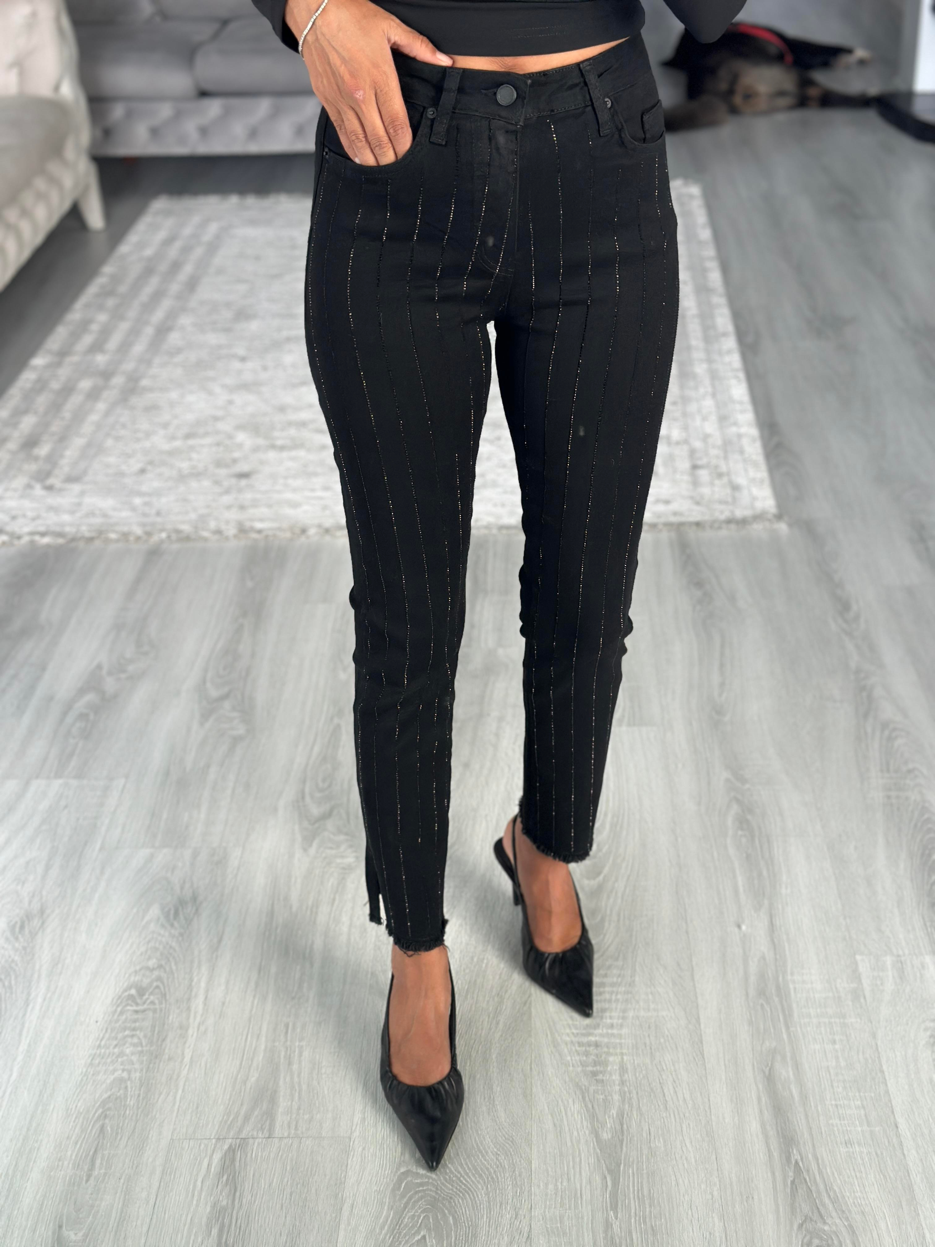 Siyah Şerit Taşlı Paçası Yırtmaçlı Kadın Jean Pantolon
