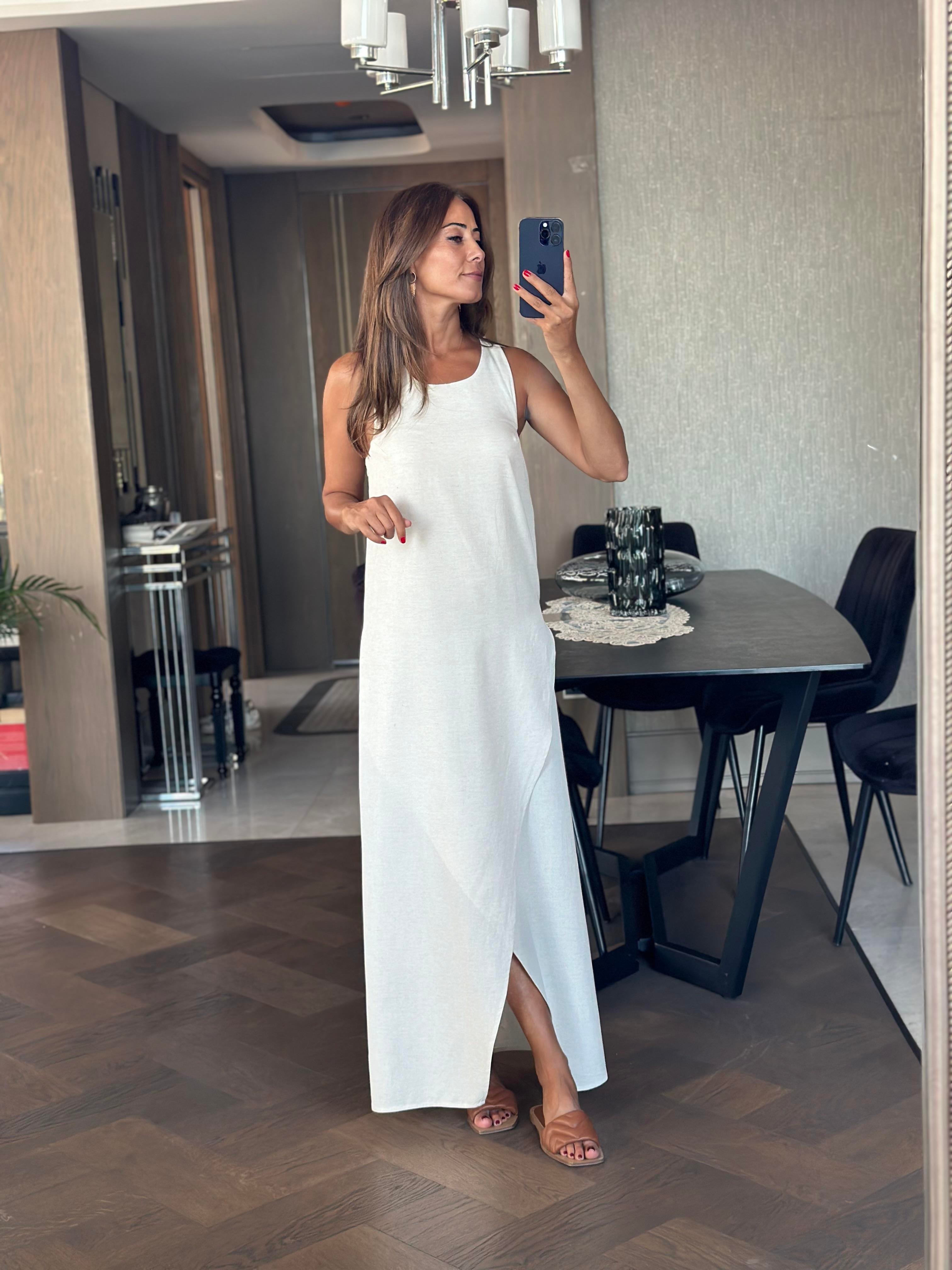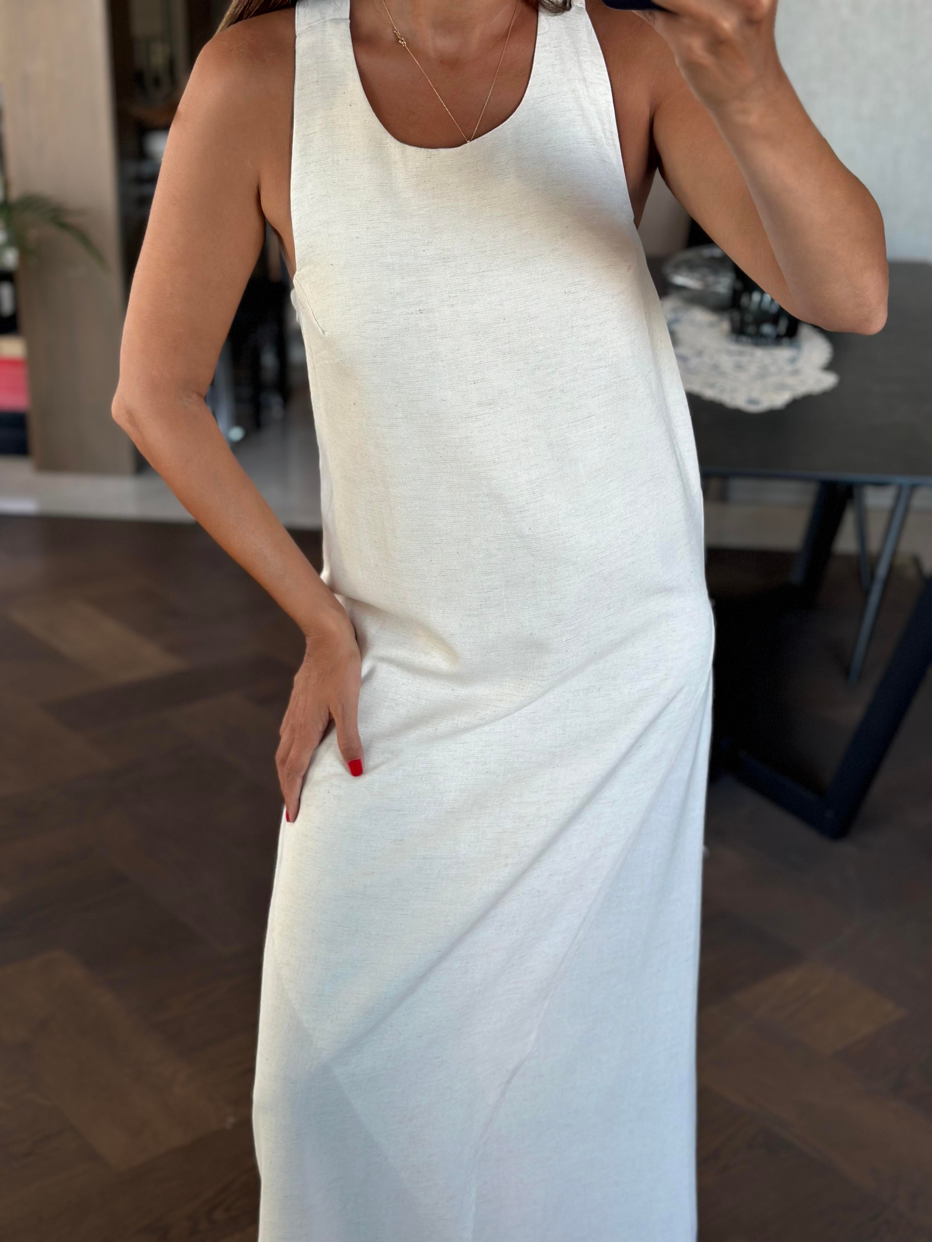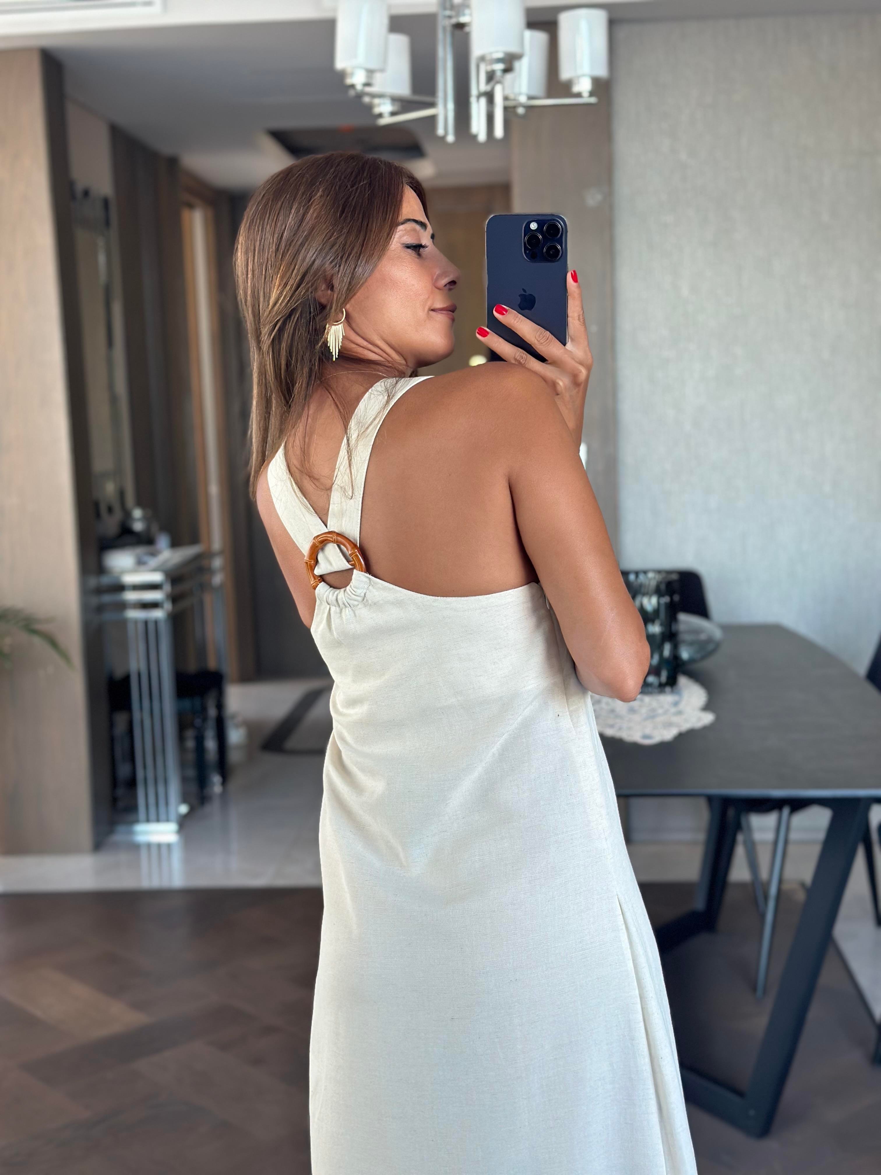 Taş Sırtı Bambu Aksesuarlı Kadın Keten Elbise