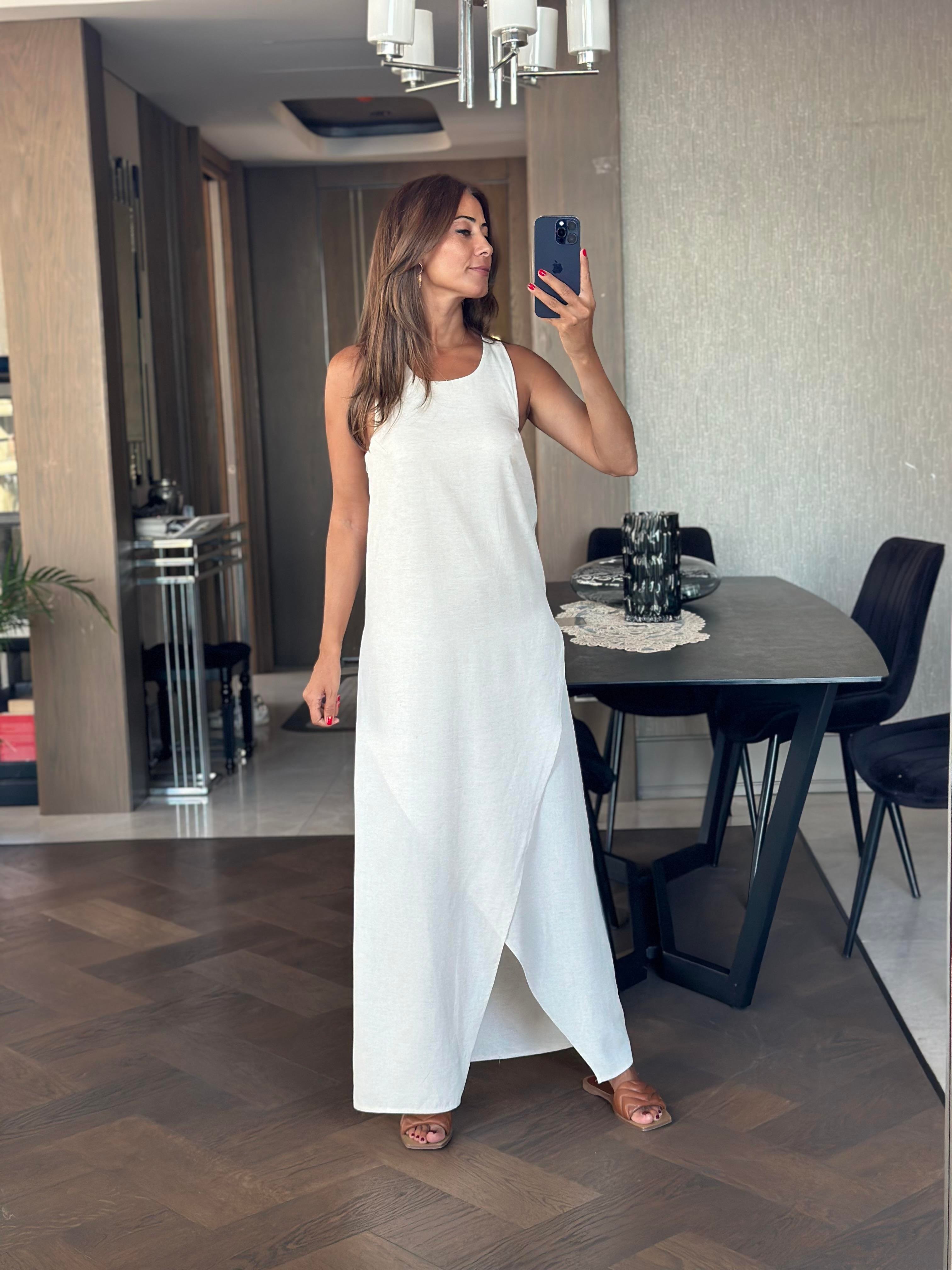 Taş Sırtı Bambu Aksesuarlı Eteği Anvelop Kadın Keten Elbise (FOR3825)