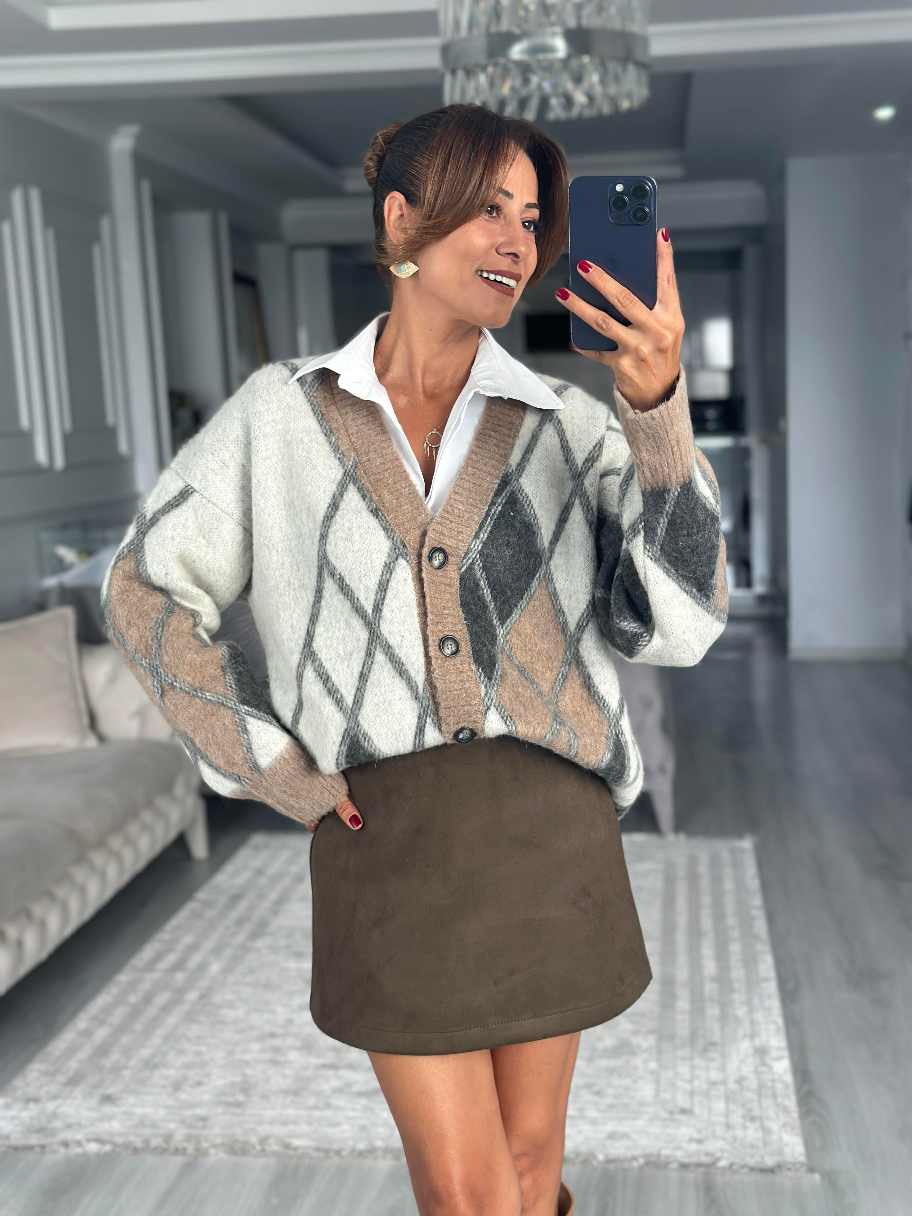 Beyaz Karol Gizli Patlı Slim Fit Kadın Gömlek Kahverengi Baklava Desen V Yaka Şardonlu Kadın Triko Hırka